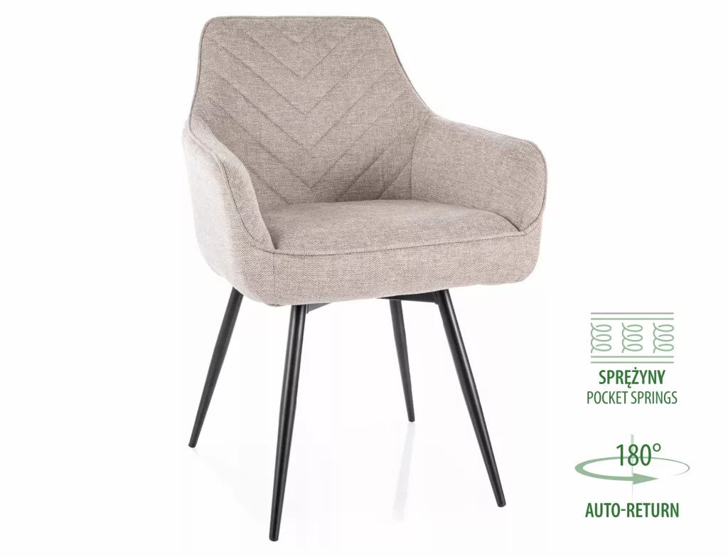 Szék, kárpitozás: Brego 31 szövet, váz: fém, szín: világos bézs / matt fekete. Automatikus visszatérítési funkció - az ülés 180 fokban elforgatható, és visszatér az eredeti helyzetébe. Zsebrugók az ülőfelületben.