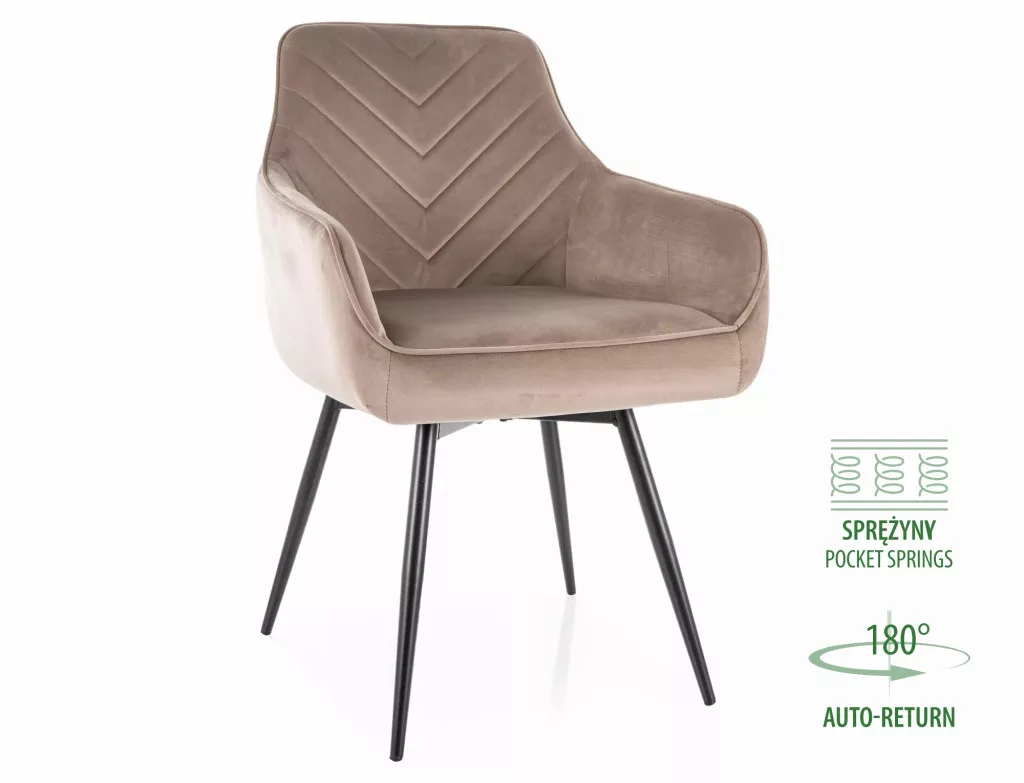 Szék, kárpitozás: Bluvel 40 bársony szövet, váz: fém, szín: sötét bézs / matt fekete. Automatikus visszatérítési funkció - az ülés 180 fokban elforgatható, és visszatér az eredeti helyzetébe. Zsebrugók az ülőfelületben.