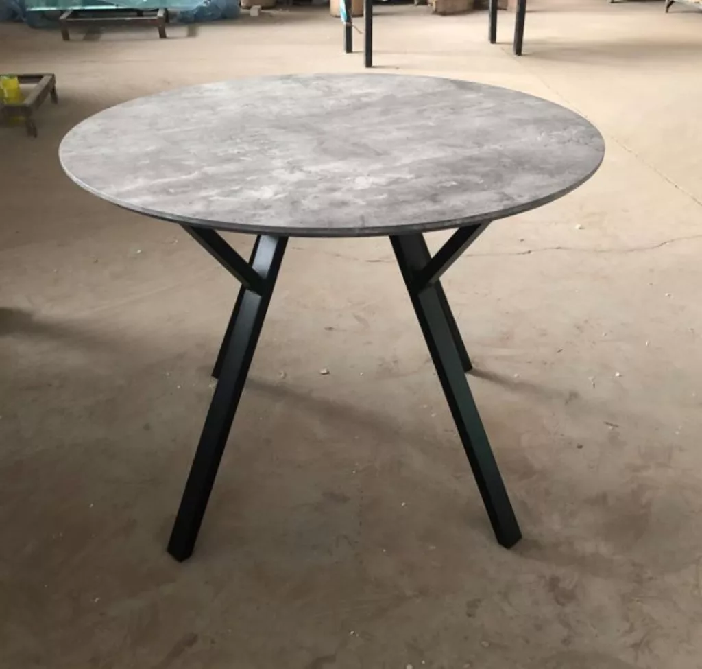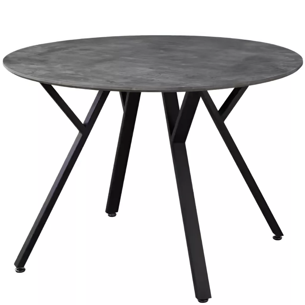 Egyszerű étkezőasztal kerek asztallappal. Az asztallap átmérője 110 cm, vastagsága 1,8 cm, és szürke színű MDF-ből készült. A változatos formájú alap 25x50 mm átmérőjű fémcsövekből készült, és fekete színű porfestett. Az asztal maximális teherbírása 80 kg.
