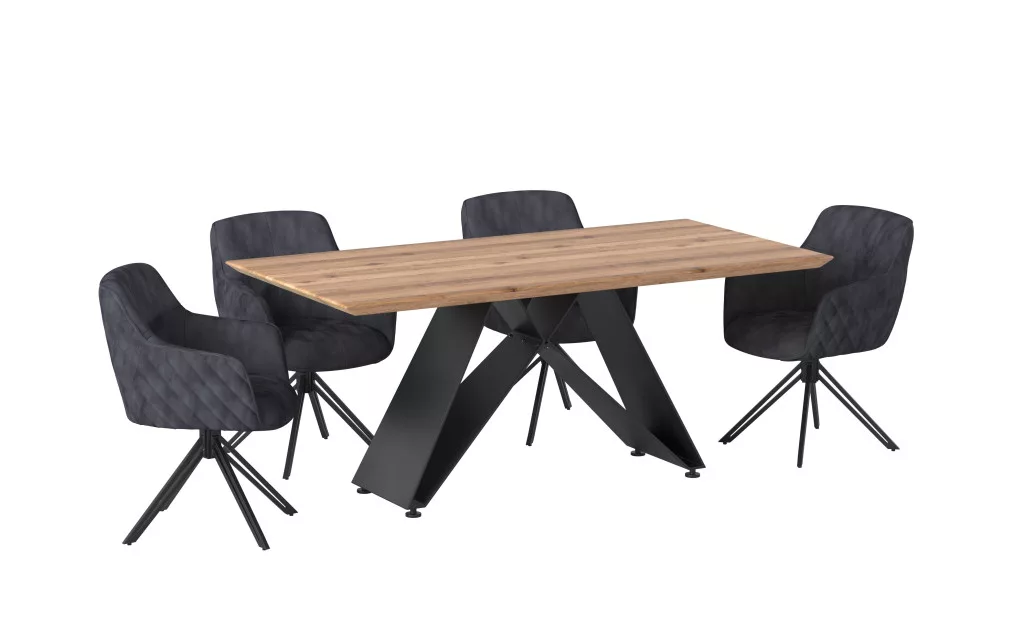 A modern étkezőszék vastagon kárpitozott puha bársony anyaggal. A szék magas karfákkal és rombusz alakúra varrt háttámlával rendelkezik. A belső oldal sima, kivéve a háttámla díszvarrását. A széle vastag díszvarrással rendelkezik. Az ülőhab sűrűsége 28 kg/m3, a háttámla habjának sűrűsége 24 kg/m3. Az alap négyzet alakú fémcsövekből készült, fekete matt festékkel porfestve. Az alap középen kifelé lejtő. A szék 180°-ban elforgatható. A maximális teherbírás 120 kg.