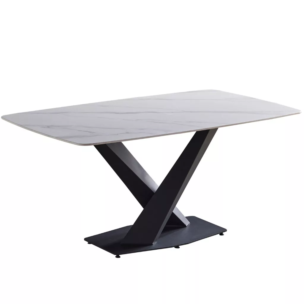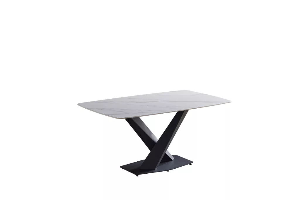 Gyönyörű étkezőasztal, amely a modern stílust ötvözi a klasszikus márvány megjelenéssel. Az asztallap szinterezett kőből készült, gyönyörű Hófehérke márvány mintával. A szinterezett kő több különböző színű természetes kő kombinációjából készül, és számos előnnyel rendelkezik a hagyományos kerámiával szemben. Erősebb, mint a monoblokk kerámialapok, és nem olyan könnyen törik. Természetesen vízálló is, összehasonlítva a természetes gránitlapokkal. Környezetbarátabb is, mint a kémiailag kezelt kvarclapok. A teljes lap vastagsága 12 mm. Az asztallap tartója MDF anyagból készült. Az asztal lábai, amelyek két keresztezett oszlop formájában vannak, fémből készültek és fekete porfestett bevonattal vannak ellátva a jobb védelem érdekében. Az asztal két különböző méretben kapható. Az asztal maximális teherbírása 120 kg.