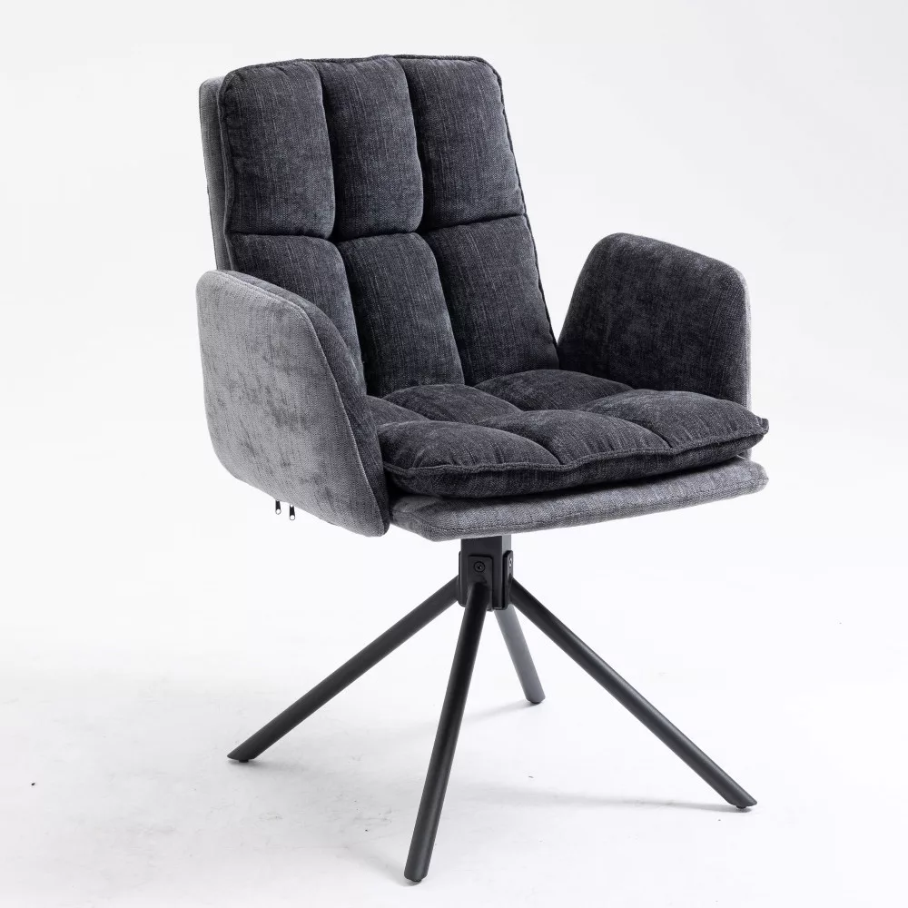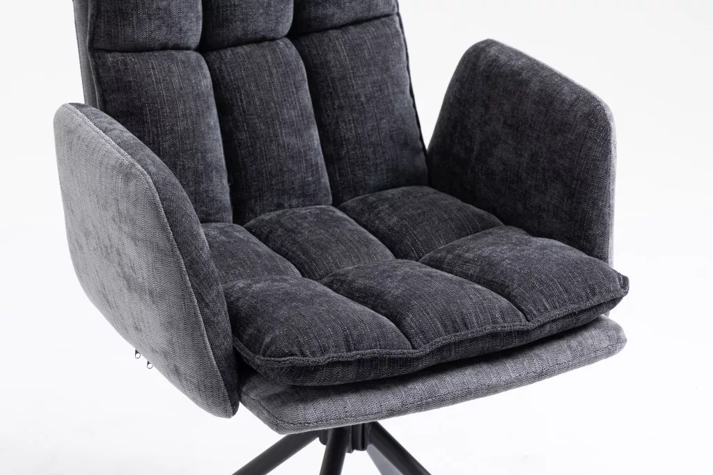 Modern étkezőszék egyszerű dizájnnal, amely remekül mutat otthonában. A szék minőségi, semleges szürke színű szövettel kárpitozott. Az ülőfelület és a háttámla két rétegű kárpitozással rendelkezik, a külső réteg díszes varrással van steppelve a szebb megjelenés érdekében. A szék kárpitozott karfákkal is felszerelt, amelyek szükség esetén levehetők. A vastagon kárpitozott ülőfelület 44 cm mély, és a kárpitozással együtt akár 51 cm-rel is a talaj felett lehet. A háttámla 44 cm magas. A négylábú lábú lábtartó fémből készült, és fekete porfestett bevonattal rendelkezik a jobb védelem érdekében. A háttámlán beépített fogantyú található a könnyű mozgatás érdekében. A szék 180°-ban elforgatható. A szék maximális teherbírása 120 kg.
