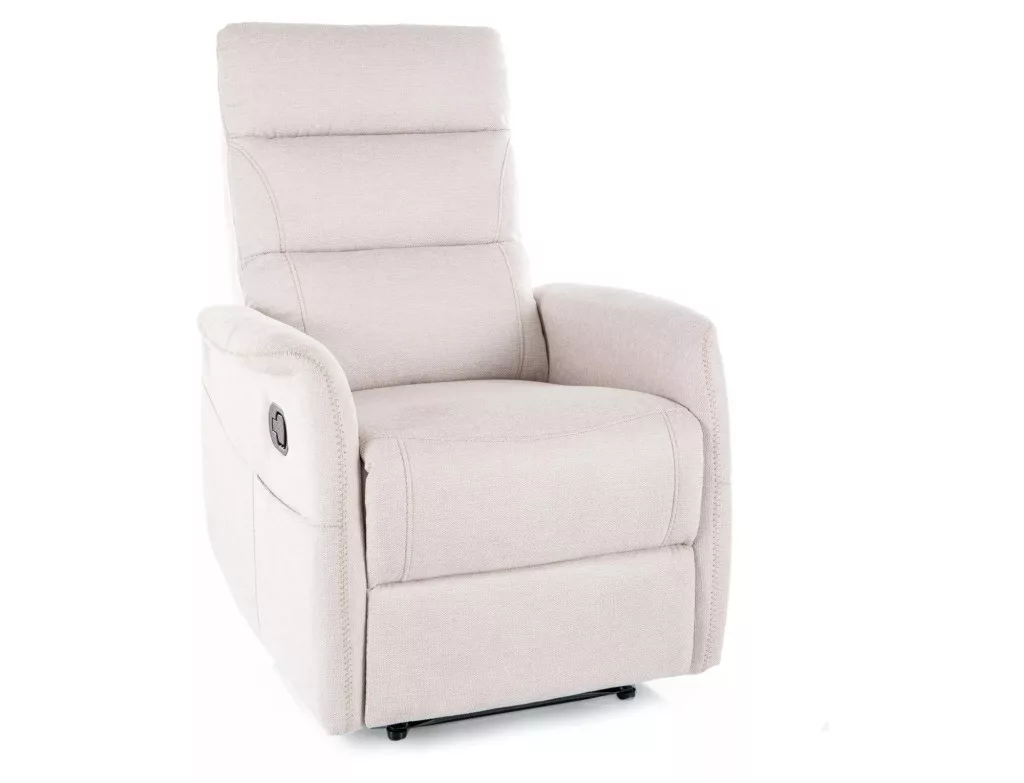 Dönthető fotel masszázs- és fűtésfunkcióval, Brego 22 szövetkárpittal, váz: fém, szín: világos bézs / fekete. Praktikus zseb a jobb oldalon, vezetékes távirányító a masszázsfunkcióhoz.