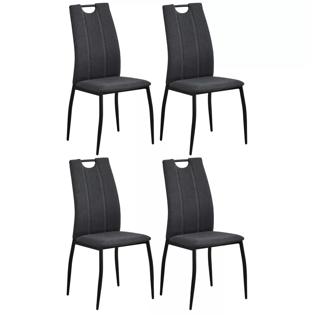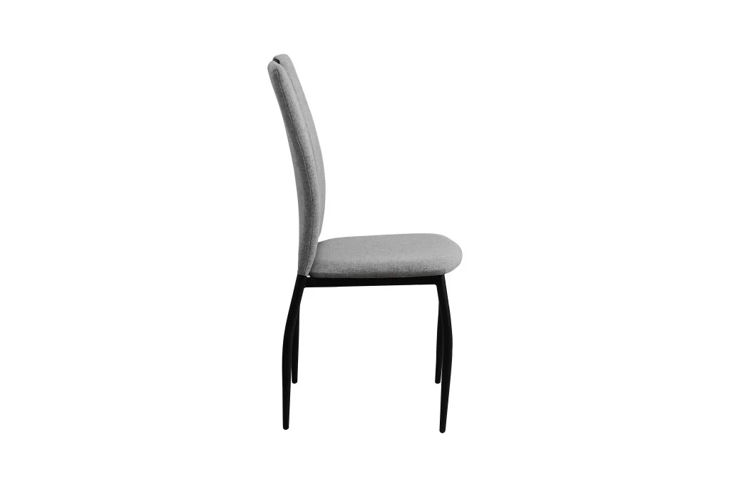 Egyszerű étkezőszék, ergonomikus háttámlával. Teljesen kárpitozott, kiváló minőségű szövettel, több szürke árnyalatban kapható. A 4 cm vastag ülőfelület kényelmes ülést biztosít, a háttámla pedig fogantyúval is rendelkezik a szék könnyű mozgatásához. Az alap ívelt fémcsövekből készült, 2,5-1,6 cm átmérőjű. A csövek matt fekete porfestékkel vannak bevonva a jobb védelem érdekében. A szék maximális teherbírása 120 kg.