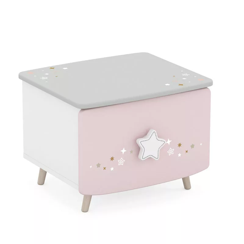 Éjjeliszekrény alkalmas gyermekszobához. Fehér, rózsaszín és szürke szín kombinációja. Az éjjeliszekrény MDF anyagból és forgácslapból készül, vastagsága 15 mm. Van egy fiókja, amelyen egy fogantyú díszcsillaggal, ezüst csillámokkal. A fiók mérete 35,1x30x16 cm. A szekrény négy fa színű lábon áll, természetes színben.  Mérete:44,4x38,8x33,7cm