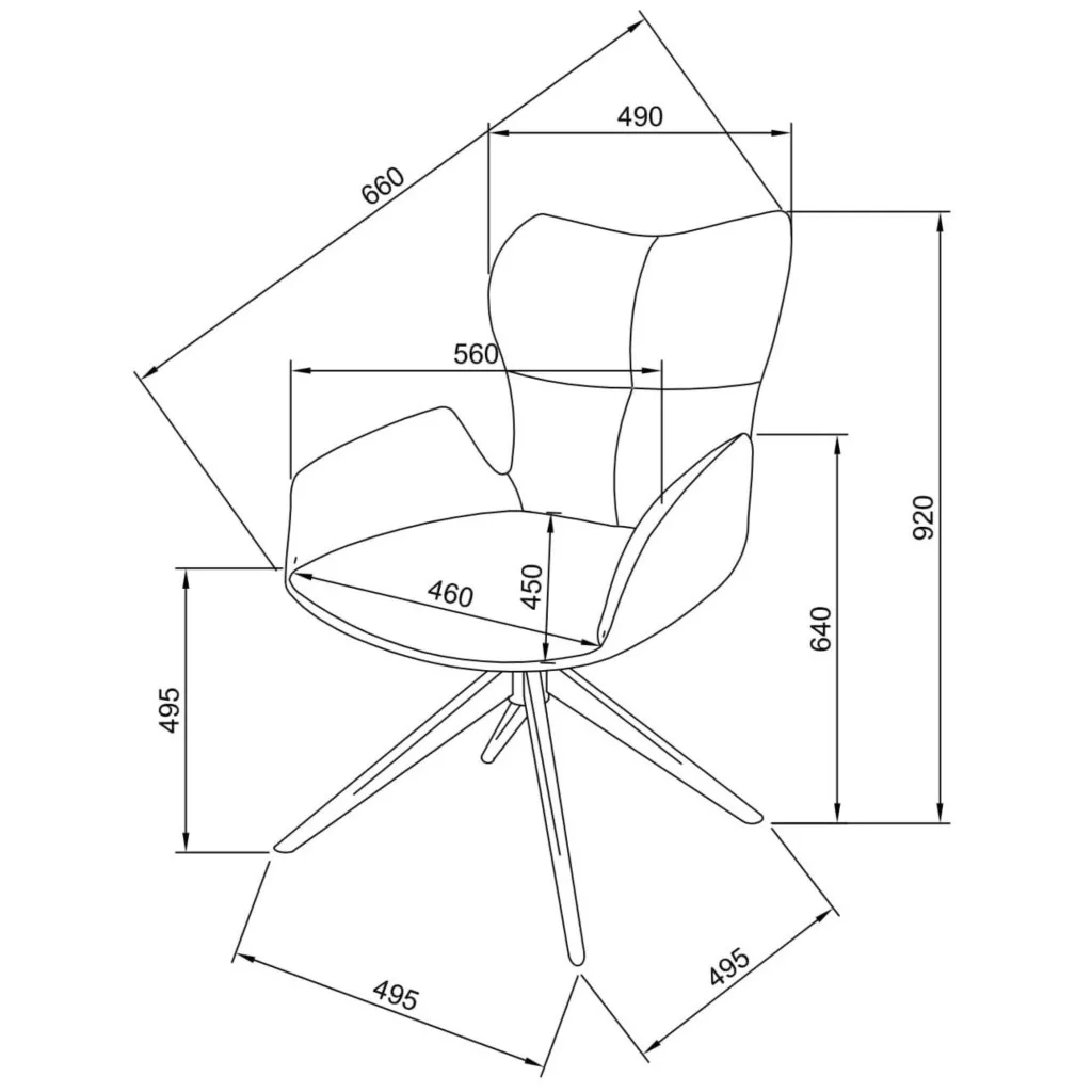 A szék jól párnázott ülése 49 cm magas. Az integrált, alacsony profilú karfák finom támasztást biztosítanak anélkül, hogy túlterhelnék a dizájnt, lehetővé téve a könnyű mozgást, miközben megőrzik a letisztult, kompakt sziluettet. A szék háttámlája dekoratív öltésekkel van steppelt, amelyek feldobják a szék ülőfelületét.
