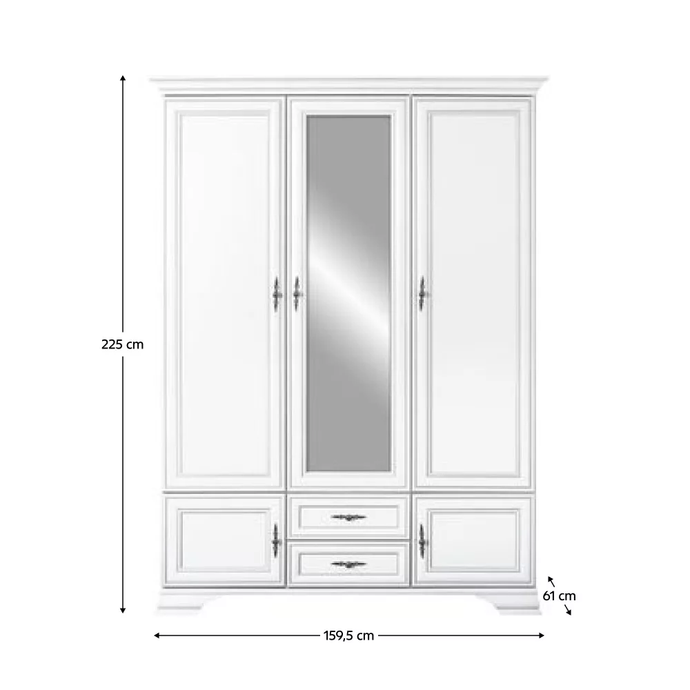 Anyag: laminált DTD Szín: alpesi fehér Méretek (SzxMéxMa): 159,5x61x225 cm Anyag vastagsága: 1,6 cm Tükörrel Ötajtós Lábakon Lábak magassága: 8 cm Fém fogantyúk Fogantyúk színe: antik ezüst Tárhely 2 fiók Fiók teherbírása: 3 kg Akasztórúd Polcos rész Polc teherbírása: 4 kg Javasoljuk a falhoz rögzíteni Szétszerelve szállítva