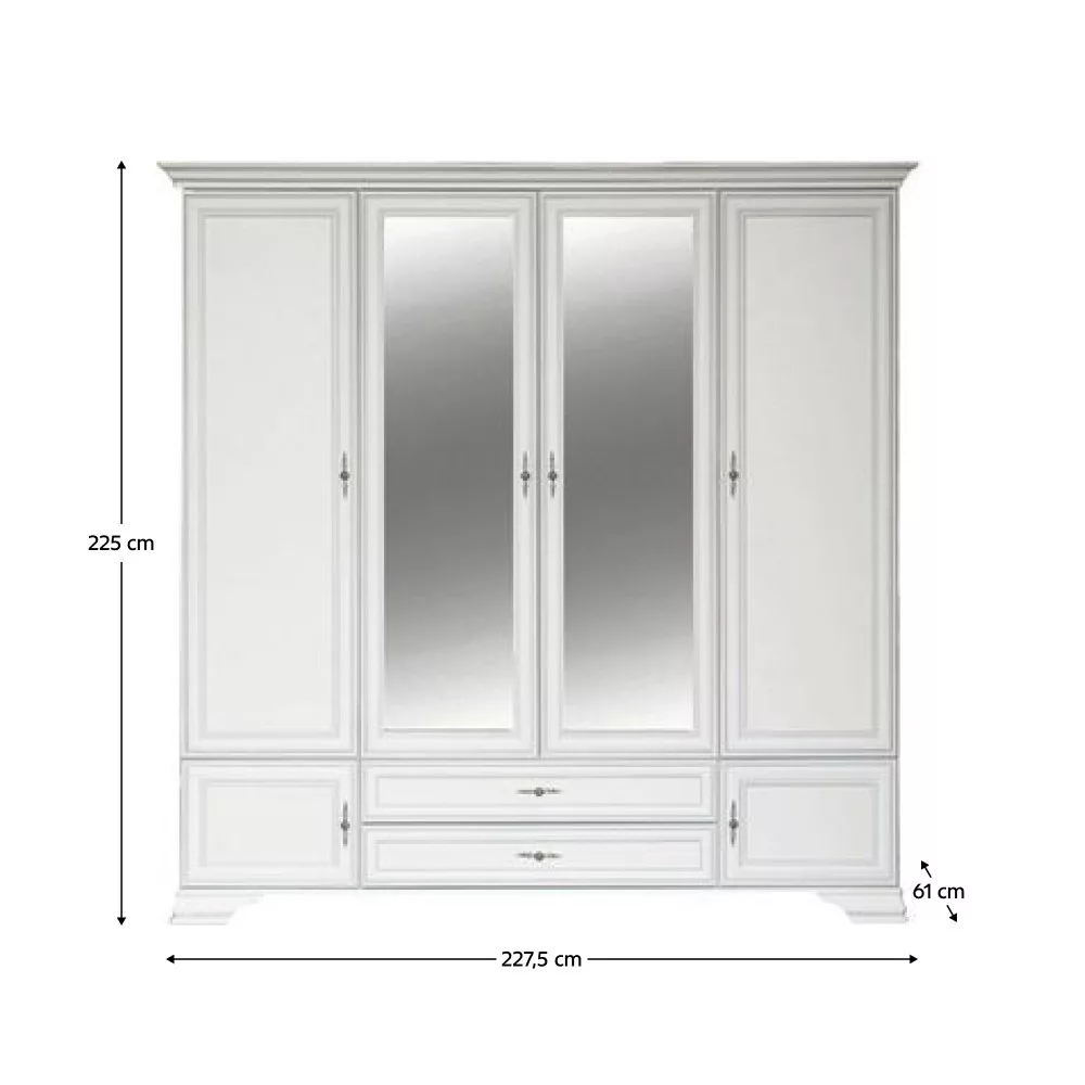 Anyag: laminált DTD Szín: alpesi fehér Méretek (SzxMéxMa): 227,5x61x225 cm Anyag vastagsága: 1,6 cm Tükörrel Hatajtós Lábakon Lábak magassága: 8 cm Fém fogantyúk Fogantyúk színe: antik ezüst Tárhely 2 fiók Fiók teherbírása: 3 kg Akasztórúd Polcos rész Polc teherbírása: 4 kg Javasoljuk a falhoz rögzíteni Szétszerelve szállítva