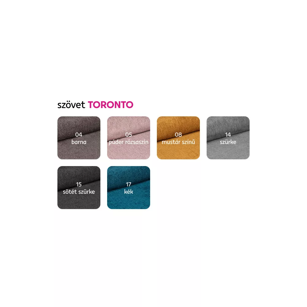 Megrendelhető a Toronto szövet 6 színváltozatában, ár: 686 900 Ft. Egyedi megrendelés esetén a megadott összeg 20%-át előlegként szükséges befizetni. Az előleg befizetése után a kérése gyártásba kerül. A szállítási idő 6-8 hét.
