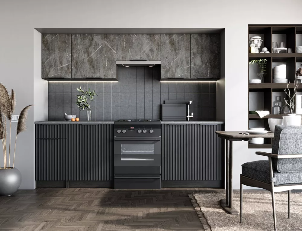 készlet hossza: 240 cm, MDF alsó szekrényhomlokzatok, gázliftes, munkalap vastag. 28 mm, szín: előlap - szürke márvány / fekete, test - szénfa, munkalap - szürke