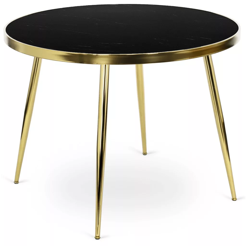 TINGA Kerek asztal Fekete/Arany A fekete és arany színben kapható Tinga asztal az elegancia és a praktikum ötvözetét testesíti meg, így tökéletes választás különféle otthoni terekbe. Univerzális kialakításának köszönhetően könnyen illeszkedik nappaliba, étkezőbe vagy konyhába, kifinomult karaktert kölcsönözve neki. Esztétika és funkcionalitás: Az edzett üveg asztallap nagy tartósságot és sérülésállóságot garantál. Kerek formája, elegáns fekete színben, márványhatással és arany szélekkel, luxus jelleget kölcsönöz az egész darabnak. Stabil és stílusos: Az asztallap masszív fém lábakból áll, amelyek nemcsak stabilitást garantálnak, hanem szokatlan formájukkal is vonzzák a tekintetet. Enyhén kiszélesedő és aranyozott kivitelben, tökéletesen illeszkednek az asztallaphoz, egységes és elegáns egészet alkotva.