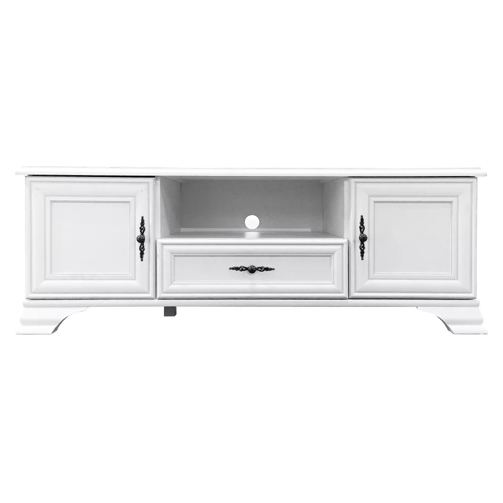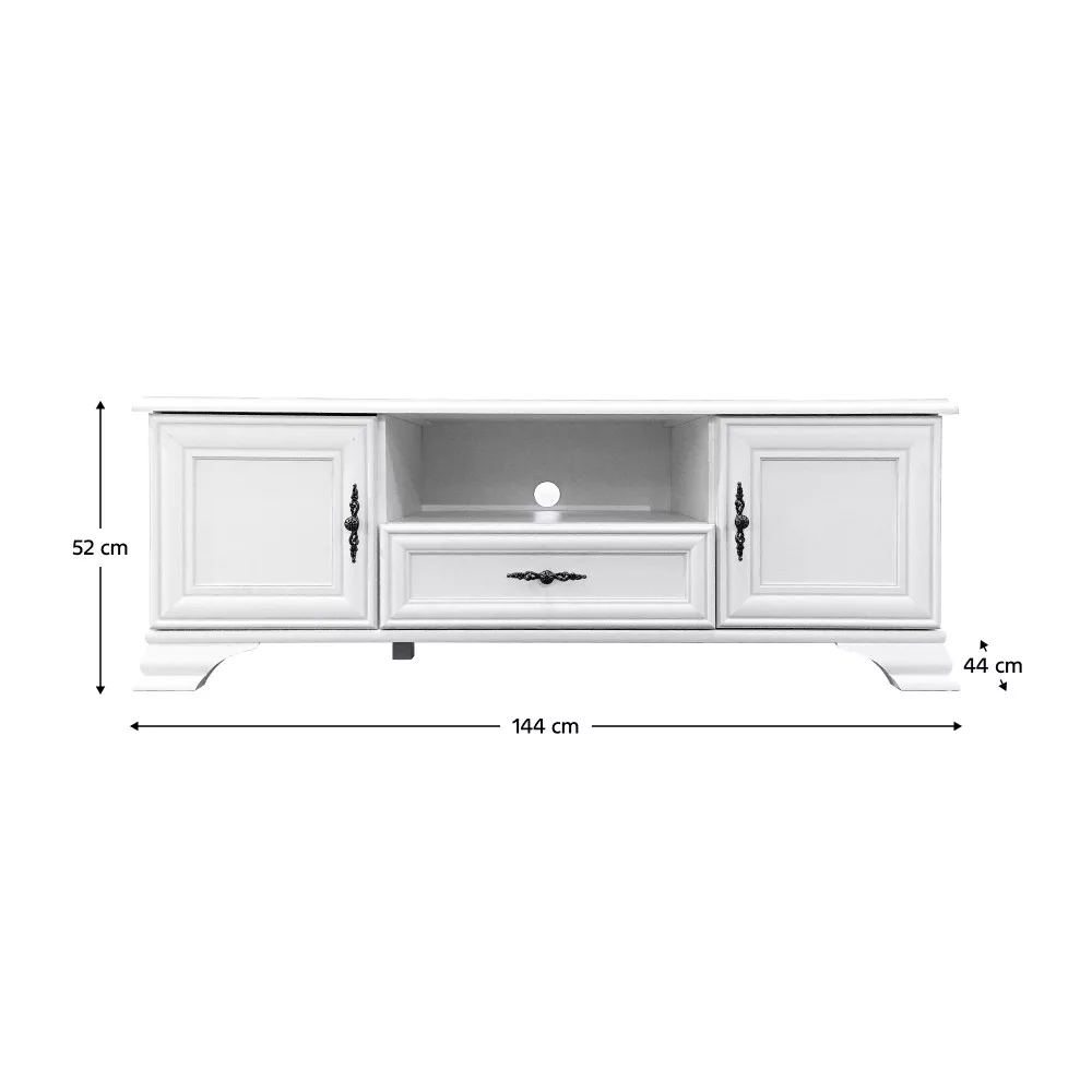 Anyag: laminált DTD Szín: alpesi fehér Méretek (SzxMéxMa): 144x44x52 cm Anyag vastagsága: 1,6 cm Fém fogantyúk Fogantyúk színe: antik ezüst Kábelkivezető nyílás Kétajtós Két szekrény Polcokkal Polc teherbírása: 4 kg Nyitott tárolóhely Egy fiók Fiók teherbírása: 3 kg Lábakon Lábak magassága: 8 cm Szétszerelve szállítva
