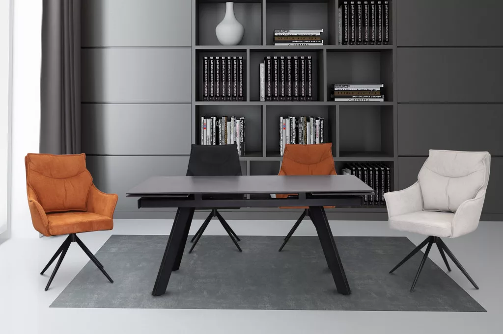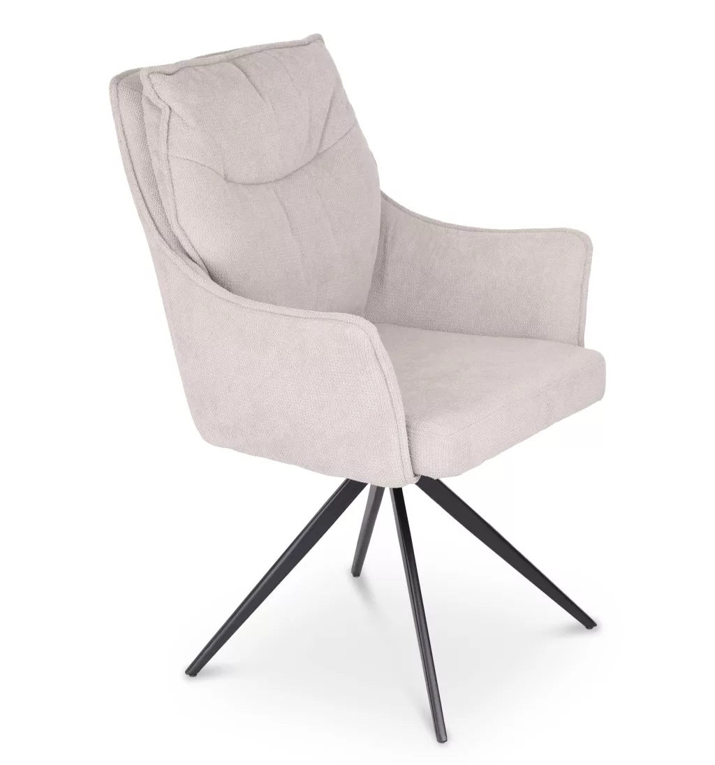 A modern étkezőszék vastagon kárpitozott puha szövettel, vékony, fix karfákkal van ellátva. Több színváltozatban kapható, sötétszürke, barna vagy bézs színben. Az ülőfelület 8,5 cm vastag, 43 cm széles és 50 cm magasságban helyezkedik el a talajtól. A fekete lábazat fémcsövekből készült, 3x1,5 cm méretű és porfestett a környezeti hatásokkal szembeni jobb védelem érdekében. A lábazatban található forgólap lehetővé teszi az ülőfelület 360°-os elforgatását. A székek mindenféle asztallal kombinálhatók, és alkalmas kiegészítői lehetnek étkezőknek, nappaliknak, konyháknak vagy akár irodáknak is. A szék maximális teherbírása 120 kg.