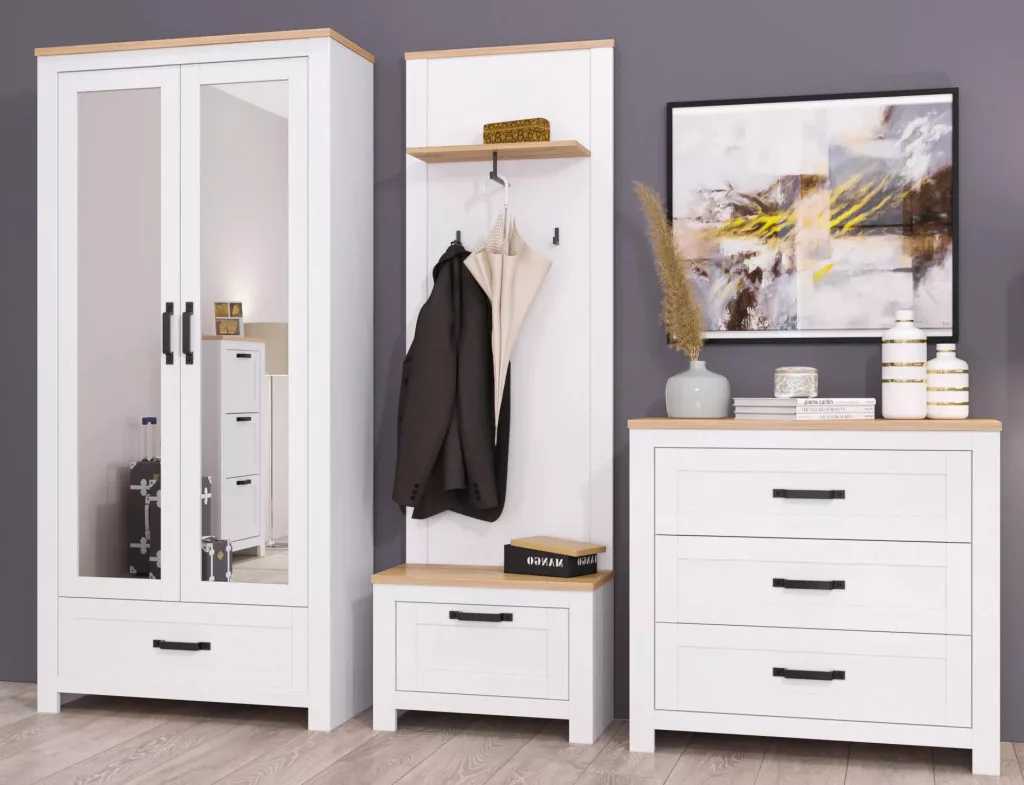 A felső és hátlap tölgy színű, a szekrény többi része fehér. A fekete műanyag fogantyúk felhívják a figyelmet, és egy kis kontrasztot adnak a modern, skandináv stílusú dizájnnak.