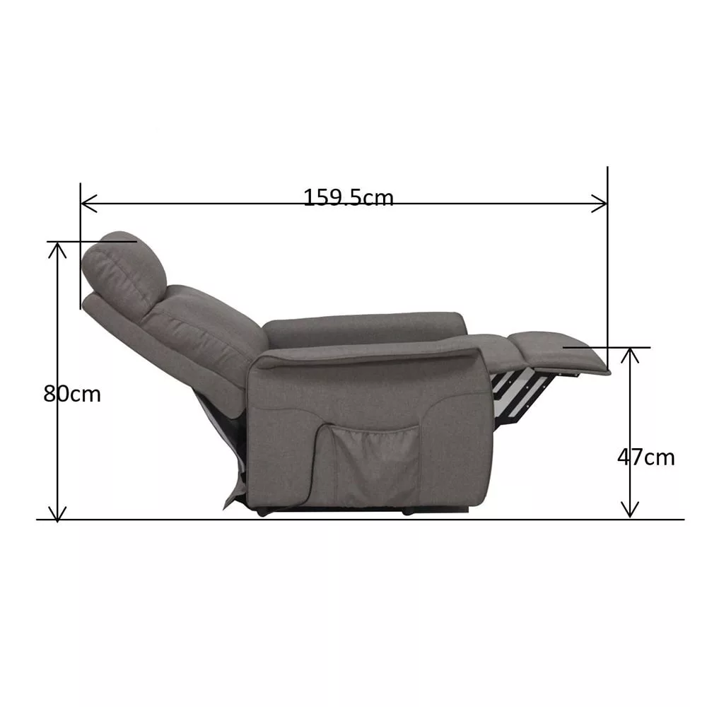 Praktikus relaxfotel, puha szövettel kárpitozva, relaxációs funkcióval felszerelve, amely leengedi a háttámlát és megemeli a lábtartót. A szék előre is dönthető, hogy segítsen a felállásban, így alkalmassá teszi azokat, akiknek nehézséget okoz a felállás. Hullámos felfüggesztéssel és rugalmas pántokkal rendelkezik. Az oldalán egy kis zseb található a távirányító funkció tárolásához. A relaxfotel mélysége 90 cm-ről 159,5 cm-re nő, a magassága pedig 87 cm-ről 80 cm-re csökken, amikor a relaxációs mechanizmus aktiválódik. A relaxfotel ülése 46 cm széles. Az ülés maximális teherbírása 136 kg.