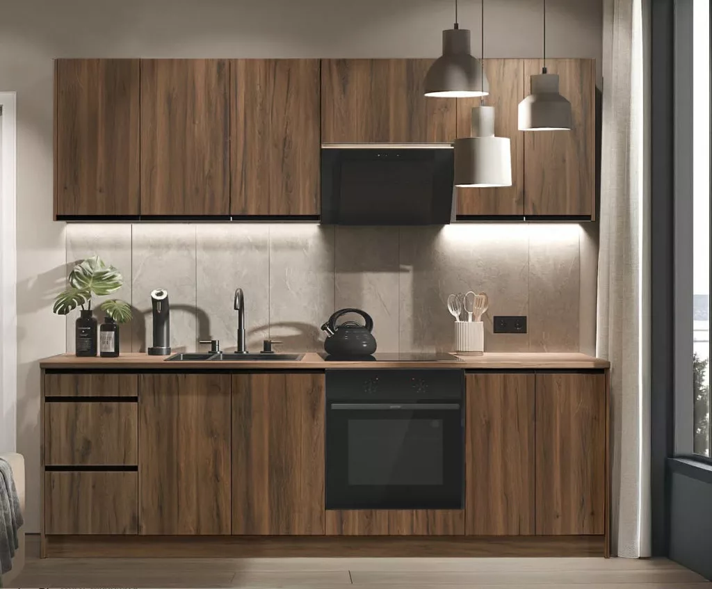 Tina konyhabútorunk letisztult, modern stílusú, amely természetes hatású frontokkal és sötét, elegáns felületekkel harmonikus, meleg hangulatot teremt. A felső és alsó elemek nagy tárolókapacitást biztosítanak, emellett pedig gondoskodnak az átlátható, rendezett megjelenésről.