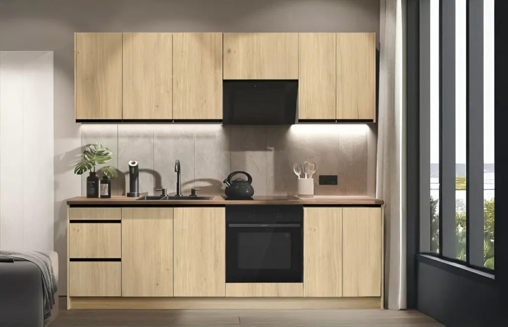 Tina konyhabútorunk letisztult, modern stílusú, amely természetes hatású frontokkal és világos, elegáns felületekkel harmonikus, meleg hangulatot teremt. A felső és alsó elemek nagy tárolókapacitást biztosítanak, emellett pedig gondoskodnak az átlátható, rendezett megjelenésről.