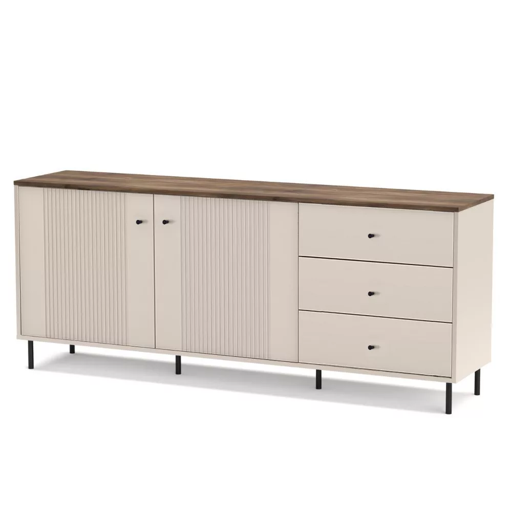 Tiramisu termékcsaládunk világos, krémszínű vázzal és meleg tónusú fa hatású belső felületekkel készül, ami elegáns kontrasztot ad és barátságos hangulatot teremt. Termékcsaládunk 13 cm magas fém lábakkal és fogantyúkkal kerül ellátásra. A bútorok frontjai bordázott felületűek.
