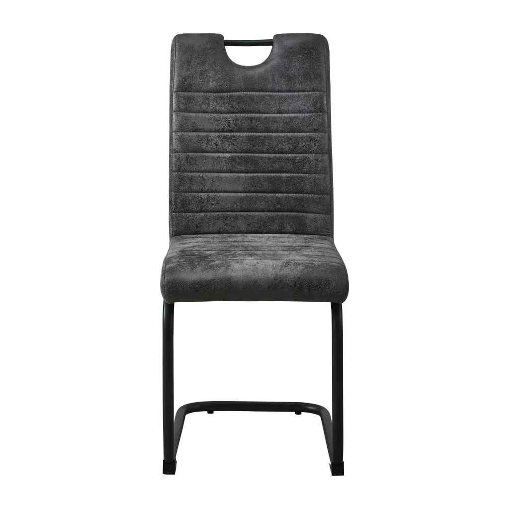 Egyszerű étkezőszék, antracit színben kapható. Az ülőfelület és a háttámla minőségi mikroszálas anyaggal kárpitozottak. Az ülőfelület 7 cm vastag, 41 cm mély és 49 cm magas a padlótól. A szék kárpitozott háttámlája fogantyúval van ellátva a könnyű mozgatás érdekében, és dekoratív párhuzamos varratokkal van steppelt. A szék alapja 2,5 cm átmérőjű kerek fémcsövekből készült, és kialakításának köszönhetően lehetővé teszi a súly nagyobb felületen való elosztását, így megakadályozva a padlófelületek károsodását. A jobb védelem érdekében az alap fekete színű porfestett. A szék maximális teherbírása 120 kg.