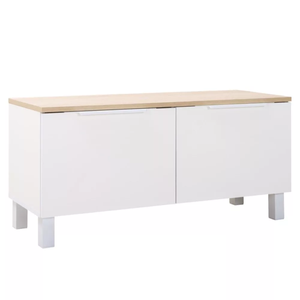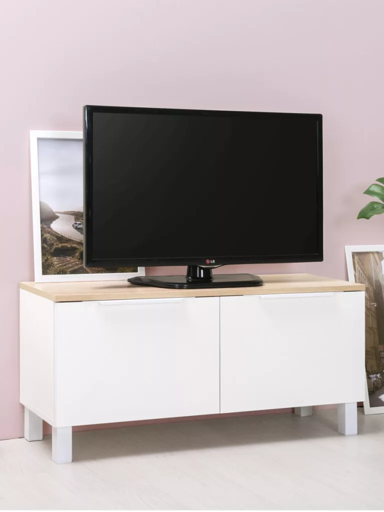 Kompakt TV-állvány, minőségi farostlemezből készült, fehér és sonoma tölgy kombinációjában. Az asztal kétrészes szekrénnyel rendelkezik, két egyenlő méretű rekesszel. Az asztallap maximális terhelhetősége 20 kg, az egyes belső polcok maximális terhelhetősége 3 kg. Minden ajtó kifelé nyílik. Az állvány négy négyzet alakú lábbal rendelkezik.Kompakt kialakításának köszönhetően tökéletesen illeszkedik az Ön életterébe.