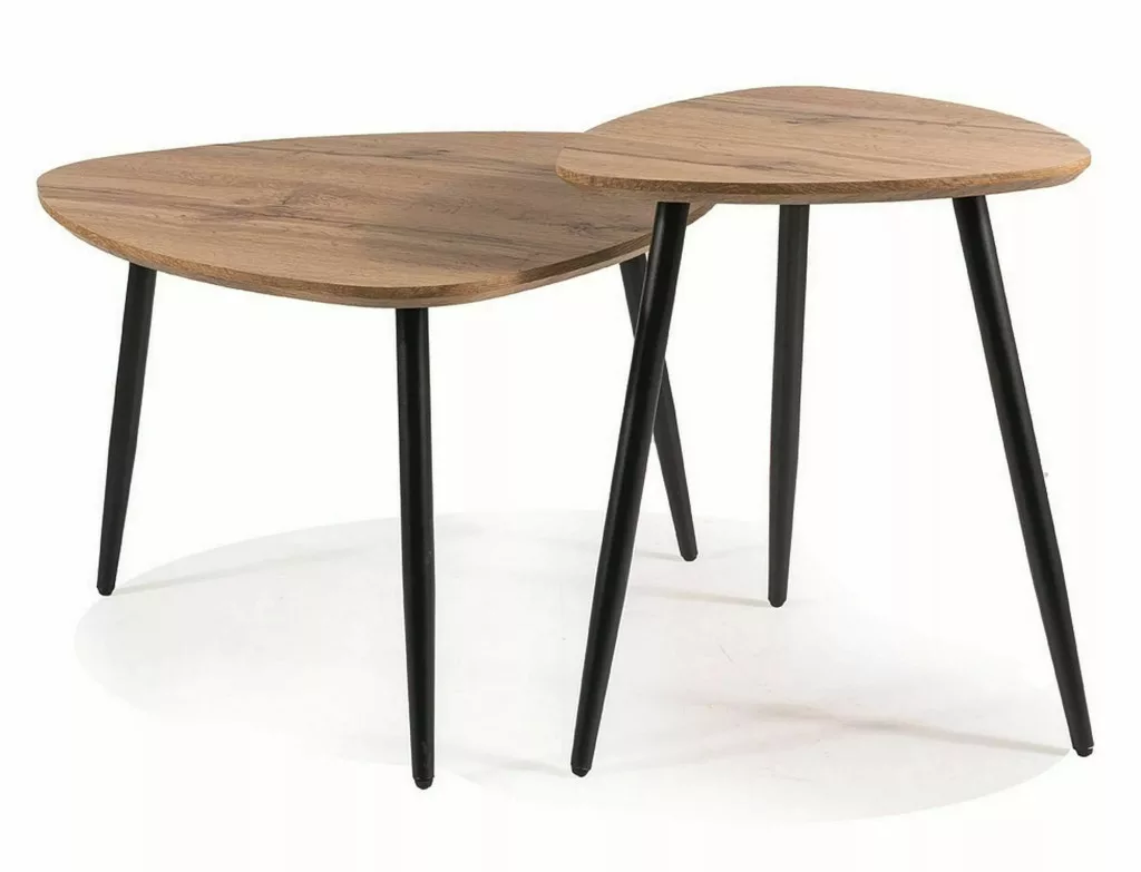 Pad szett, teteje: MDF + furnér, váz: fém, szín: kézműves tölgy / matt fekete. A kisebb asztal méretei: szélesség: 40; magasság: 48 cm.