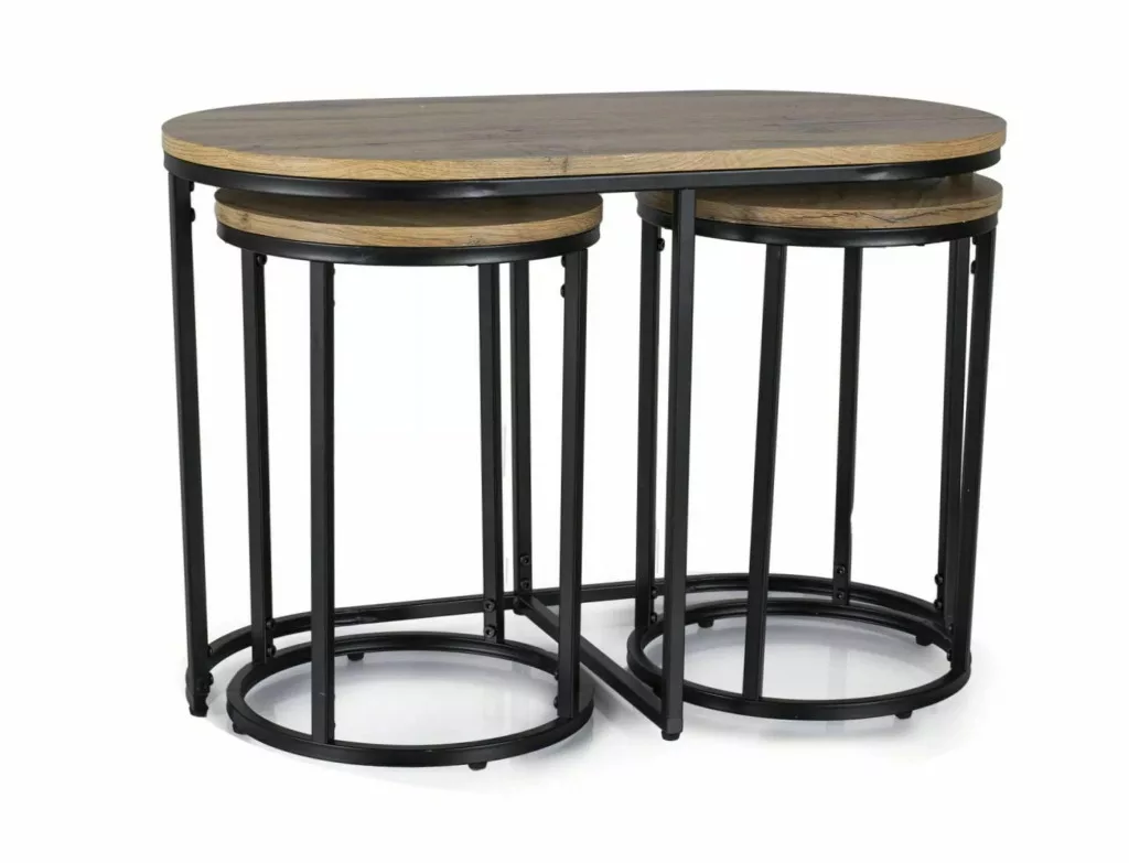 Dohányzóasztal készlet, tető: MDF + furnér, váz: fém, szín: kézműves tölgy / matt fekete. A készlet kerek padjainak méretei: szélessége 32 cm, magassága 45 cm.