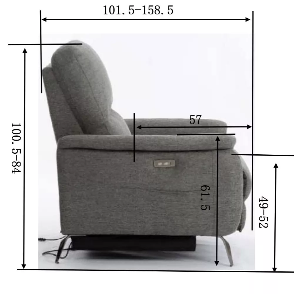 Ülőgarnitúra, puha, szürke színű szövettel kárpitozva, karosszék, kétszemélyes vagy háromszemélyes változatban, konzollal kapható. Elektromos relaxációs mechanizmussal van felszerelve, amely a lábtartót közel vízszintes helyzetbe emeli, a háttámlát pedig átlós helyzetbe süllyeszti. A háromszemélyes karfa középső része kihajtható, így két pohártartóval ellátott középső konzolt képez. A háttámla és az oldalsó karfák vastag párnázása biztosítja a kényelmet még hosszabb ülés után is. A garnitúra belseje hullámos és zsebes felfüggesztéssel is fel van szerelve. A garnitúra alapja fekete festett vasból és nikkelötvözetből készült. Minden ülőgarnitúrának helyet kell biztosítania a háttámla mögött a relaxációs mechanizmus teljes kinyúlásához.