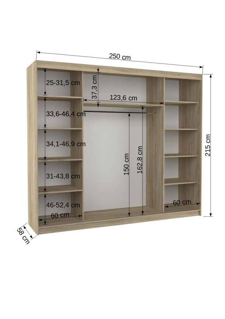 A CAMBE tolóajtós gardrób ideális megoldás a térrendezéshez. A bútor tágas polcokkal és ruhásszekrénnyel van felszerelve, ahol ruhákat, öltönyöket, külső ruházatot vagy ingeket lehet felakasztani. Az előlapra felszerelt tükrök optikailag nagyítják a teret. A tolóajtós kialakításnak köszönhetően nem kell külön helyet szánni az ajtók kinyitására, ezért tökéletes választás kis szobákba vagy keskeny előszobákba is.