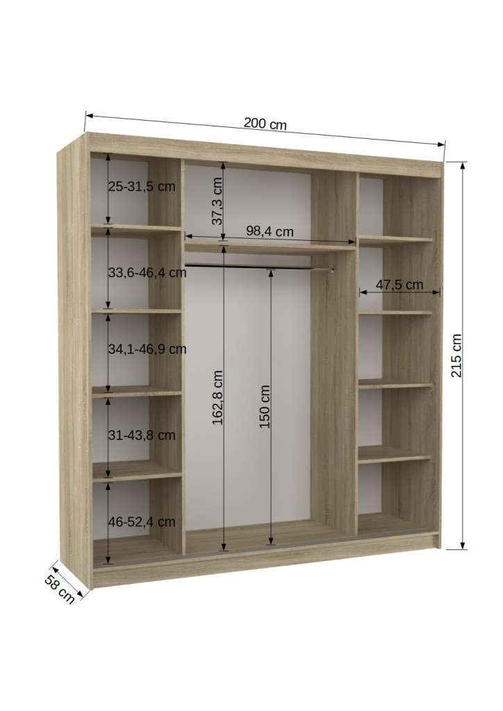 A DALMATIA tolóajtós gardróbszekrény ideális megoldás a térrendezéshez. A bútor tágas polcokkal és ruhásszekrénnyel van felszerelve, ahol ruhákat, öltönyöket, külső ruházatot vagy ingeket lehet felakasztani. Az előlapon tükröt és ezüstszínű díszes vízszintes csíkokat találsz, amik különleges stílust kölcsönöznek a bútornak. A tolóajtós kialakításának köszönhetően nem kell külön helyet szentelni a nyitáshoz, ezért tökéletes választás kis szobába vagy keskeny előszobába is.
