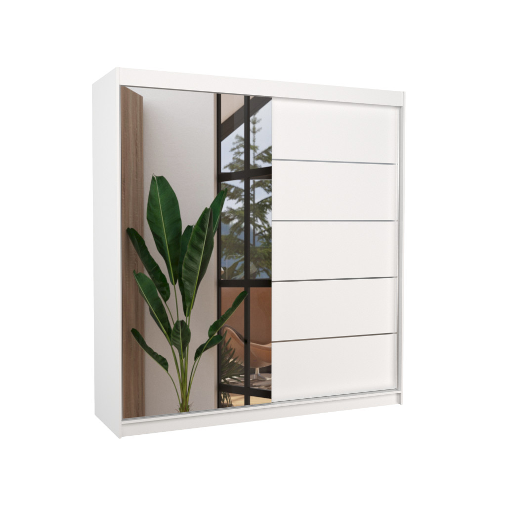 Az OLIVER tolóajtós gardróbszekrény ideális megoldás a térrendezéshez. A bútor tágas polcokkal és ruhásszekrénnyel van felszerelve, ahol ruhákat, öltönyöket, külső ruházatot vagy ingeket lehet felakasztani. Az előlapon tükröt és jellegzetes ezüstszínű vízszintes csíkokat találsz, amik egyedi stílust kölcsönöznek a bútornak. A tolóajtós kialakításának köszönhetően nem kell külön helyet szentelni a nyitáshoz, ezért tökéletes választás kis szobákba vagy keskeny előszobákba is.