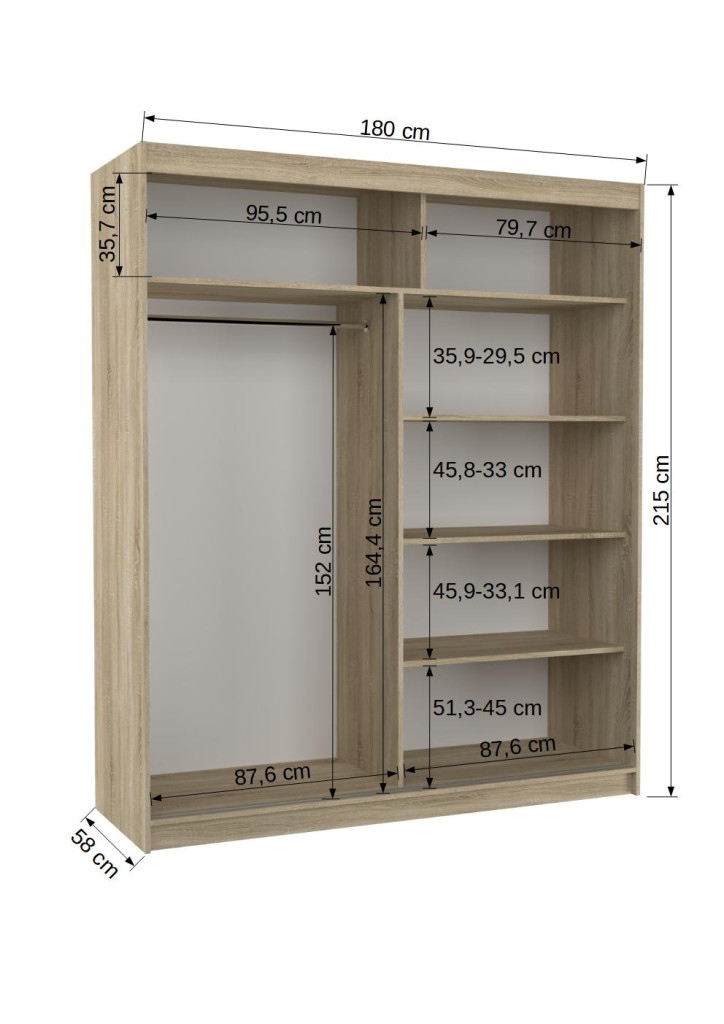 A VIKI tolóajtós tükrös szekrény ideális megoldás a térrendezésre. A bútor tágas polcokkal és ruháshurkával van felszerelve, ahol elhelyezheted ruháidat, öltönyeidet, kültéri ruházatodat vagy ingeidet. Az elején található tükör optikailag nagyobbá teszi a teret. A tolóajtós kialakításnak köszönhetően nem kell plusz helyet szánnod az ajtónyitásra, így tökéletes megoldás kis hálószobák vagy keskeny előszobák számára.