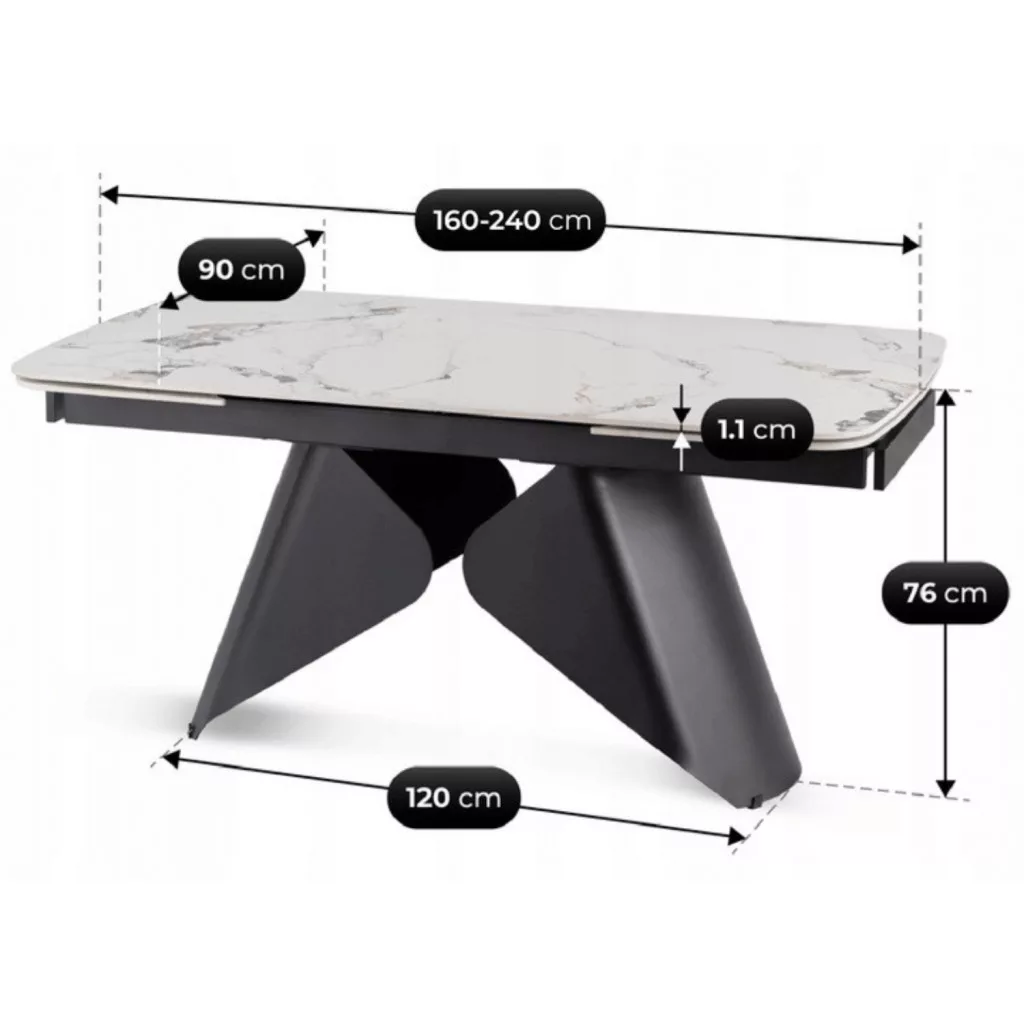 VERONA Kihúzható asztal fehér márvány/fekete kerámia színben. Modern és funkcionális asztalt keres? A Verona modell a tökéletes választás. Elegáns formája remekül mutat étkezőben, nappaliban vagy kereskedelmi helyiségben, könnyed és elegáns hatást kölcsönözve a belső térnek. Kiváló minőség és időtlen stílus. Prémium kerámiából készült, tömör fémvázra szerelt asztal jellemzői: szinterezett kvarc asztallap – ellenáll a karcolásoknak, a magas hőmérsékletnek és az intenzív használatnak; egyszerű karbantartás – a felület nem szívja magába a nedvességet vagy a szagokat, és gyorsan tisztítható; tartósság és antibakteriális tulajdonságok – a kerámia nem vetemedik, ellenáll a foltoknak és a zsírnak, így évekig megőrzi kiváló megjelenését. Geometrikus talp matt fekete színben. A matt fekete fém talp elegáns, modern jelleget kölcsönöz az asztalnak. A világos márványlappal kombinálva olyan kombinációt hoz létre, amely tökéletesen kiegészíti mind a modern, mind a csillogó belső tereket. Praktikus bővítőrendszer: A bővítőfunkciónak köszönhetően a Verona asztal könnyen alkalmazkodik a különféle igényekhez – a mindennapi étkezésektől a nagyobb ünnepségekig. Az asztallap két rejtett toldó segítségével 160 cm-ről 240 cm-re bővíthető. A sima és könnyed csúszómechanizmusnak köszönhetően az asztal kihúzása gyerekjáték. Kihúzás után az asztal akár 10 fő kényelmes befogadására is alkalmas – tökéletes ünnepi vacsorákhoz és családi összejövetelekhez. Modern luxus: A fehér márvány és a fekete, geometrikus lábazat kombinációja kifinomult kontrasztot teremt. Ez a bútordarab eleganciájával rabul ejti, és egy csipetnyi modernitást visz az enteriőrjébe. Válassza ki a stílust – válassza a Verona asztalt.