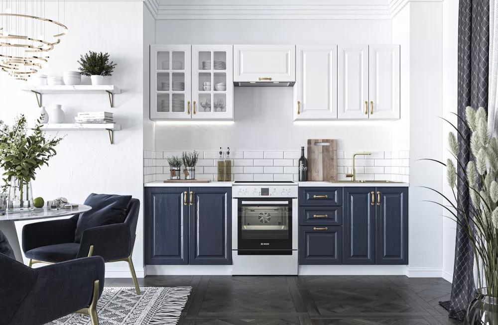 240 cm, gázliftes, munkalap vastag. 28 mm, MDF homlokzatok, szín: előlap - fehér / sötétkék, test - fehér, munkalap - fehér