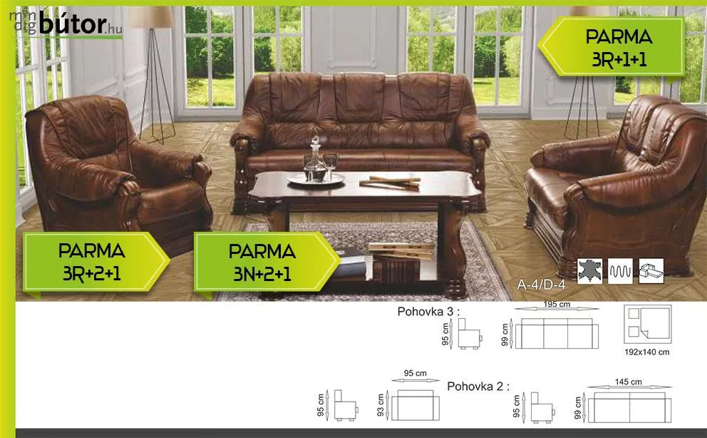 Stílus és elegancia. Ez a klasszikus, valódi bőr borítású Parma ülőgarnitúra, mely kiváló választás ha hosszú távra tervezel és időtálló formavilágot szeretnél.