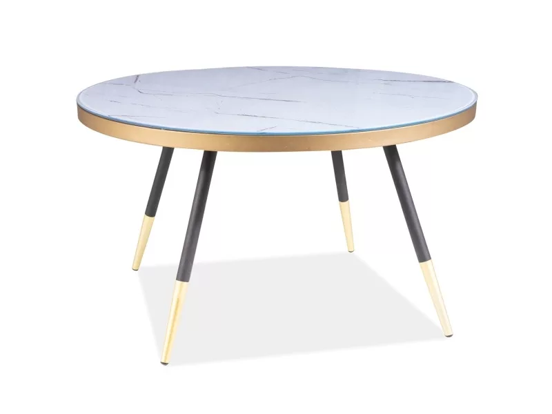 Dohányzóasztal, asztallap: üveg + furnér, keret: fém, szín: fehér, márványhatású / fekete + arany.
