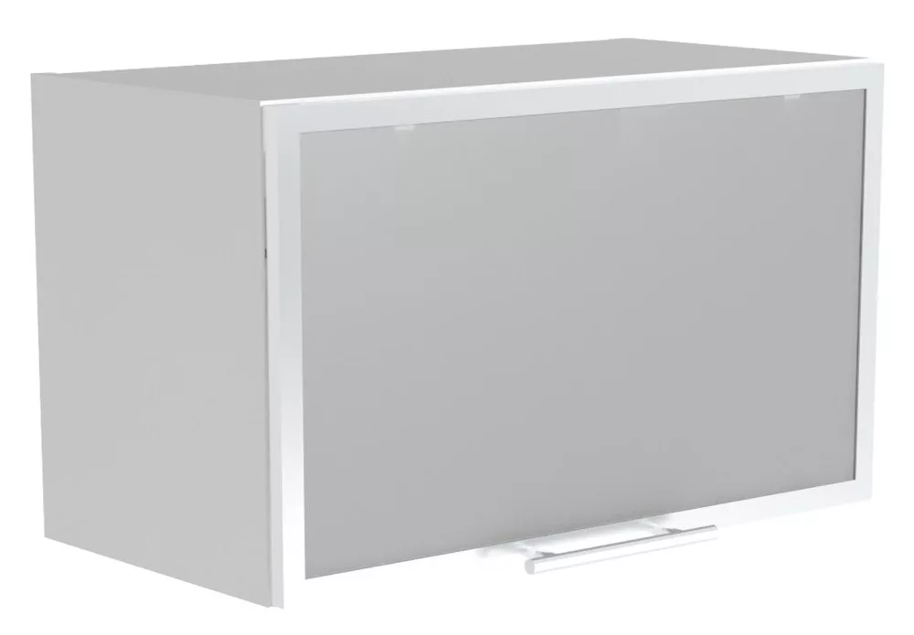 Felnyíló ajtós konyhai felső, üveges elem, gázteleszkópos felnyíló vasalattal. Alumínium keretes, fehér színű matt üveggel.