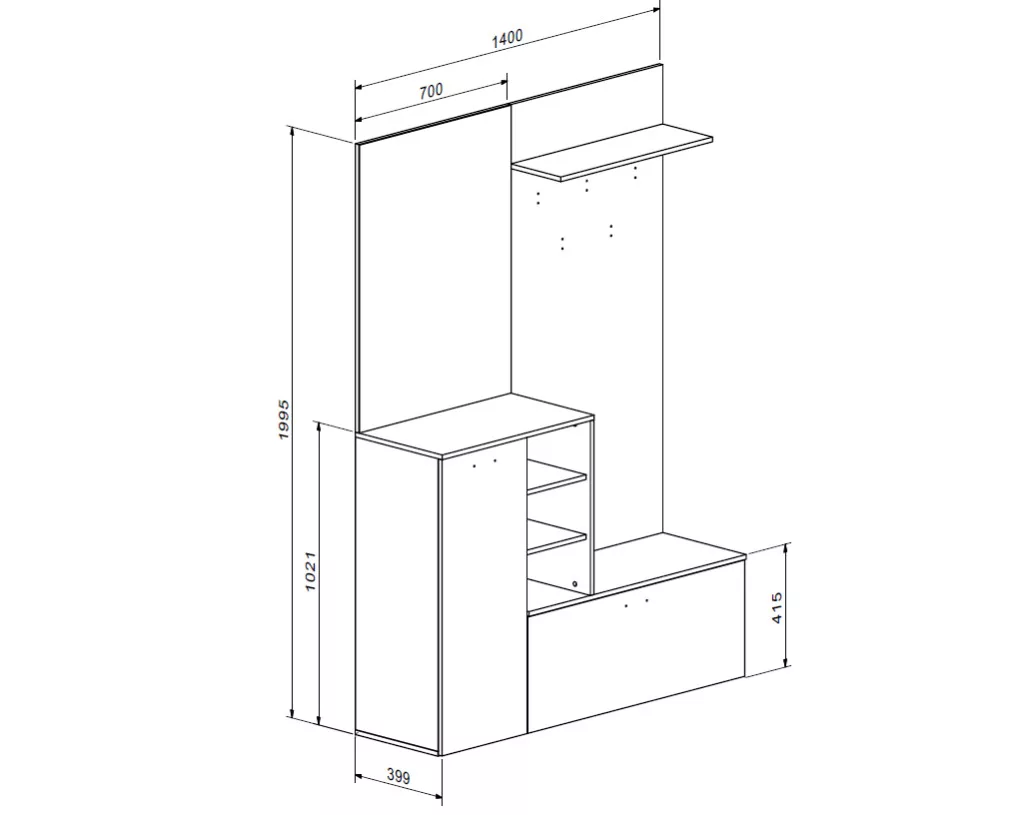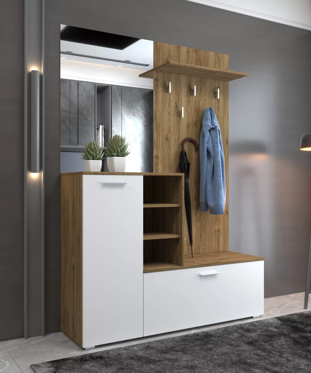 A Vetlanda előszoba összeállítás tökéletes választás egy rendezett és stílusos előszoba berendezéséhez. A praktikus polcok, két szekrény és a tükör gondoskodnak a kényelmes tárolásról, miközben modern megjelenést kölcsönöznek a térnek. Letisztult formavilágának köszönhetően nagyszerűen illeszkedik a modern enteriőrökbe.