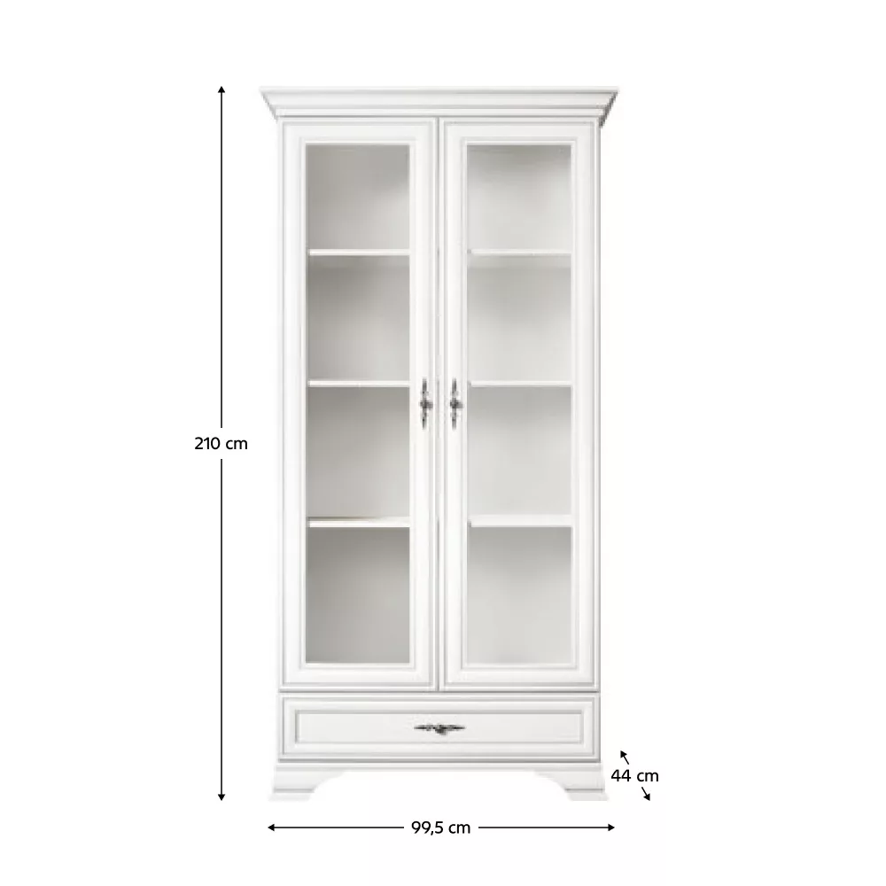 Anyag: laminált DTD/üveg Szín: alpesi fehér Méretek (SzxMéxMa): 99,5x44x210 cm Anyag vastagsága: 1,6 cm Fém fogantyúk Fogantyúk színe: antik ezüst Fiók Fiók teherbírása: 3 kg Üveges ajtókat tartalmaz Polcos Polc teherbírása: 4 kg Lábakon Lábak magassága: 8 cm Javasoljuk a falhoz rögzíteni Szétszerelve szállítva