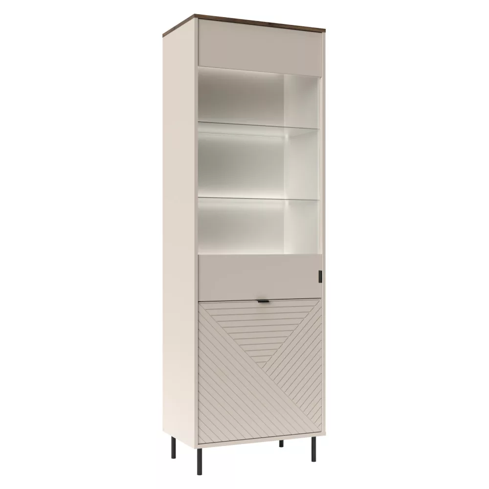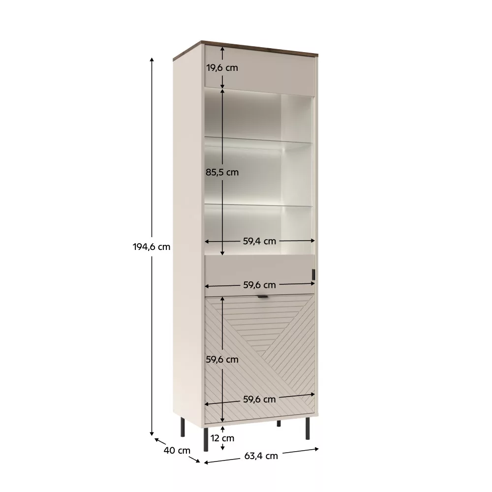 Anyag: laminált DTD/fóliázott MDF/ABS élek/üveg Szín: kasmír/castello tölgy Méretek (SzxMéxMa): 63,4x40x194,6 cm Anyag vastagsága: 1,6 cm Kétajtós Két szekrény Alsó szekrény méretei (SzxMa): 59,6x59,6 cm Polcos Üveges töltet Üveges töltet méretei (SzxMa): 59,6x85,5 cm Univerzális ajtók Fogantyúkkal Fogantyúk anyaga: fém Fogantyúk színe: fekete Lábakon Lábak anyaga: fém Lábak színe: fekete Lábak magassága: 12 cm Polc teherbírása: 5 kg Üveges polc teherbírása: 3 kg Dekoratív ajtók Modern dizájn Ajánljuk a falhoz rögzíteni LED világítás nélkül LED világítás megvásárolható a kínálatunkból Szétszerelve szállítva