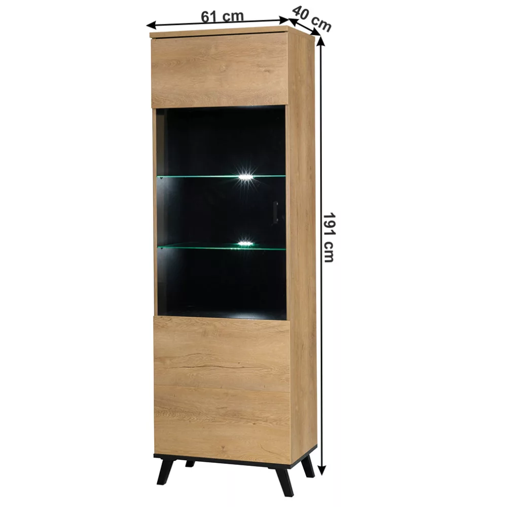 Anyag: laminált DTD/műanyag Szín: tölgyfa lefkas/fekete Méretek (SzxVxH): 61x40x191 cm Alsó tér magassága a padlótól: 12 cm Egyajtós vitrin ABS élek Műanyag lábak LED világítás nélkül szállítva LED világítás hozzárendelhető Modern stílus Bontásban szállítva