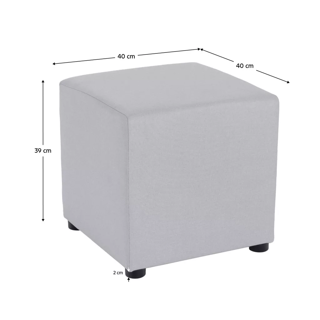 Anyag: Savana szövet 84 Színváltozat: világosszürke A szövet kopásállósága a Martindale teszt szerint: 100 000 ciklus Méretek (SzxMéxMa): 40x40x39 cm Ülés magassága: 39 cm Ülés mélysége: 40 cm Zsámoly töltete: faforgács/purhab Teherbírás: 100 kg Műanyag lábakkal Lábak magassága: 2 cm Súly: 2 kg Egészben szállítva
