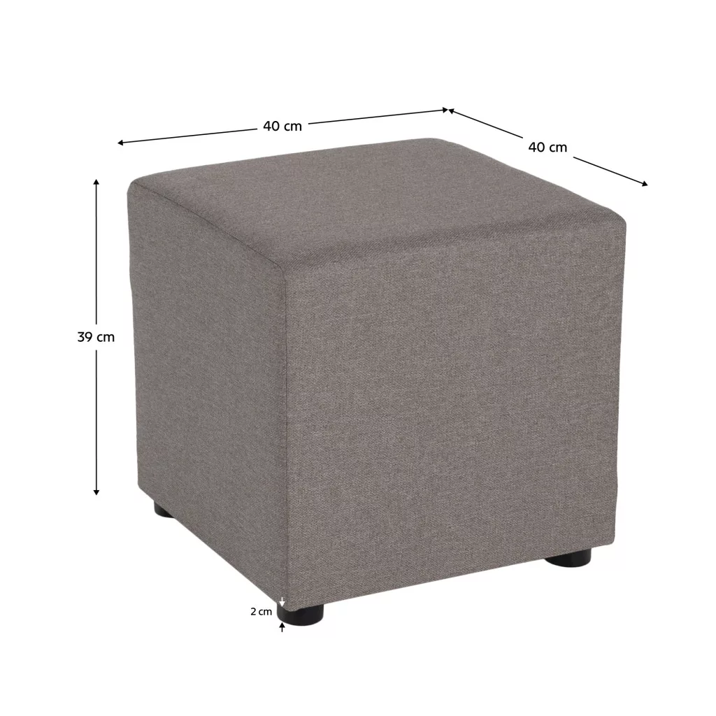 Anyag: Twist szövet 03 Színváltozat: szürkésbézs Taupe A szövet kopásállósága a Martindale teszt szerint: 45 000 ciklus Zsámoly töltete: faforgács/purhab Méretek (SzxMéxMa): 40x40x39 cm Ülés magassága: 39 cm Ülés mélysége: 40 cm Teherbírás: 100 kg Műanyag lábakkal Lábak magassága: 2 cm Súly: 2 kg Egészben szállítva
