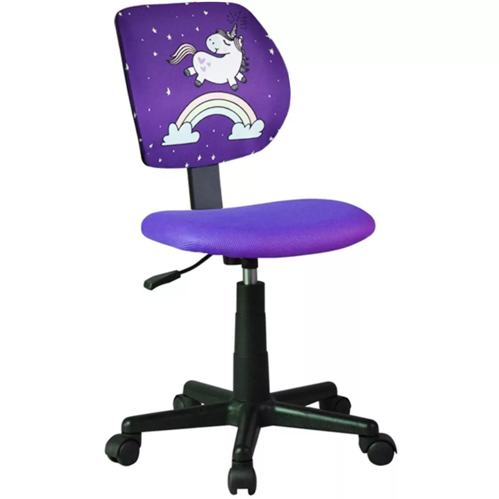 Kényelmes lila ülőfelületű és háttámlájú forgószék, egyszarvú mintával.