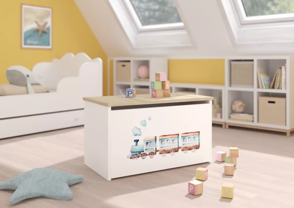 A DARIA játéktároló láda tökéletes rejtett tárolója gyermeked különféle kincseinek. A könnyen kezelhető emelővel a kicsi könnyen kinyithatja és bezárhatja a ládát. A láda eleje fehér színű és színes nyomatokkal is díszíthető.