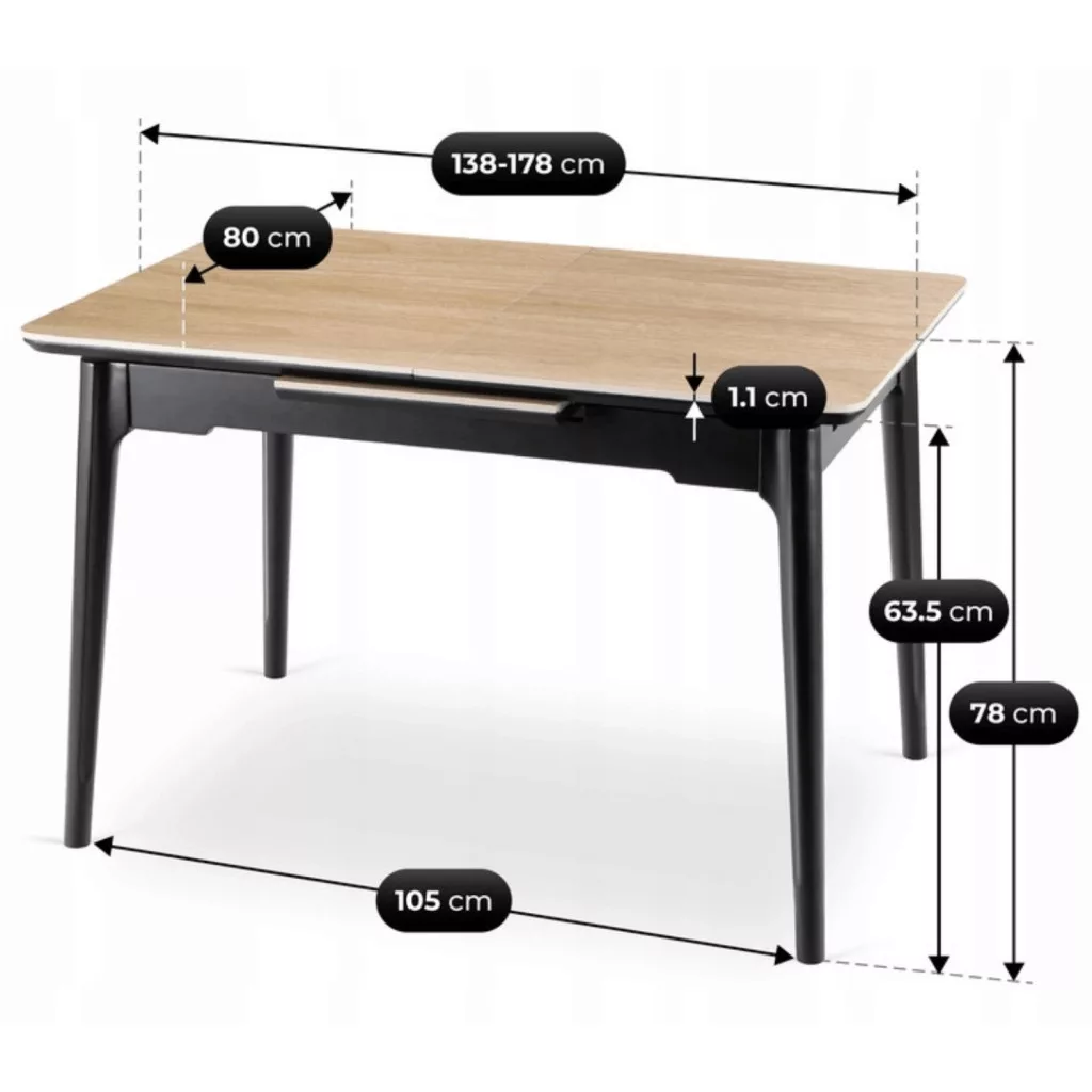 SAMER Tölgyfa/Fekete Kerámia Kihúzható Asztal. Olyan asztalt keresel, amely minimalista dizájnt ötvöz a funkcionalitással? A Samer modellt modern belső terek szem előtt tartásával tervezték. Elegáns formája tökéletes étkezőkbe, nappalikba és konyhákba, valamint kereskedelmi helyiségekbe, például éttermekbe, kávézókba és szállodákba. A Samer asztal kifinomult kialakítása tömör fa szerkezetre épül. Megkülönböztető jellemzői közé tartozik a prémium kerámia munkalap – ellenáll a karcolásoknak, a magas hőmérsékletnek és az intenzív használatnak; könnyen kezelhető – a felület nem szívja magába a nedvességet vagy a szagokat, így a tisztítás gyors és egyszerű; valamint tartós és antibakteriális tulajdonságok – a kerámia nem vetemedik és nem veszíti el a fényét, így évekig megőrzi tökéletes megjelenését. Funkcionális bővítőrendszer: A modern bővítőrendszernek köszönhetően a Samer asztal könnyen adaptálható bármilyen alkalomra – a mindennapi étkezésektől kezdve a nagyobb családi és baráti összejövetelekig. Az asztallap 138 cm-ről 178 cm-re bővíthető egy rejtett betét segítségével, amely simán kicsúszik az asztal közepéből. A csúszómechanizmus simán és precízen működik, így az asztal kibontása gyerekjáték. Sokoldalú stílus: A tölgyfa asztallap és a fekete lábazat kombinációja olyan kompozíciót hoz létre, amely tökéletesen kiegészíti a modern, loft és klasszikus enteriőröket. Egyszerű, elegáns formája nemcsak praktikus, hanem kivételesen stílusos bútordarabmá is teszi a Samer asztalt. Válassza a Samer asztalt, és vigyen kényelmet otthonába.