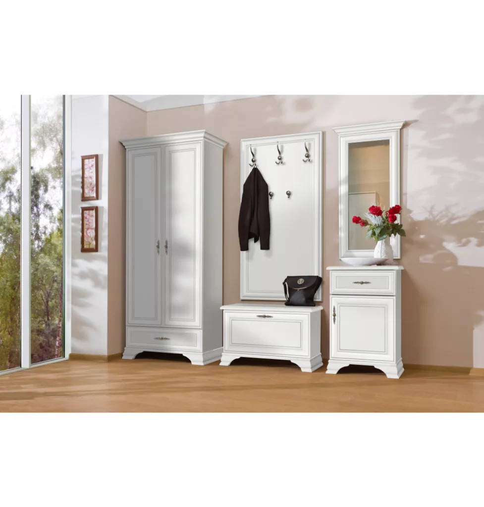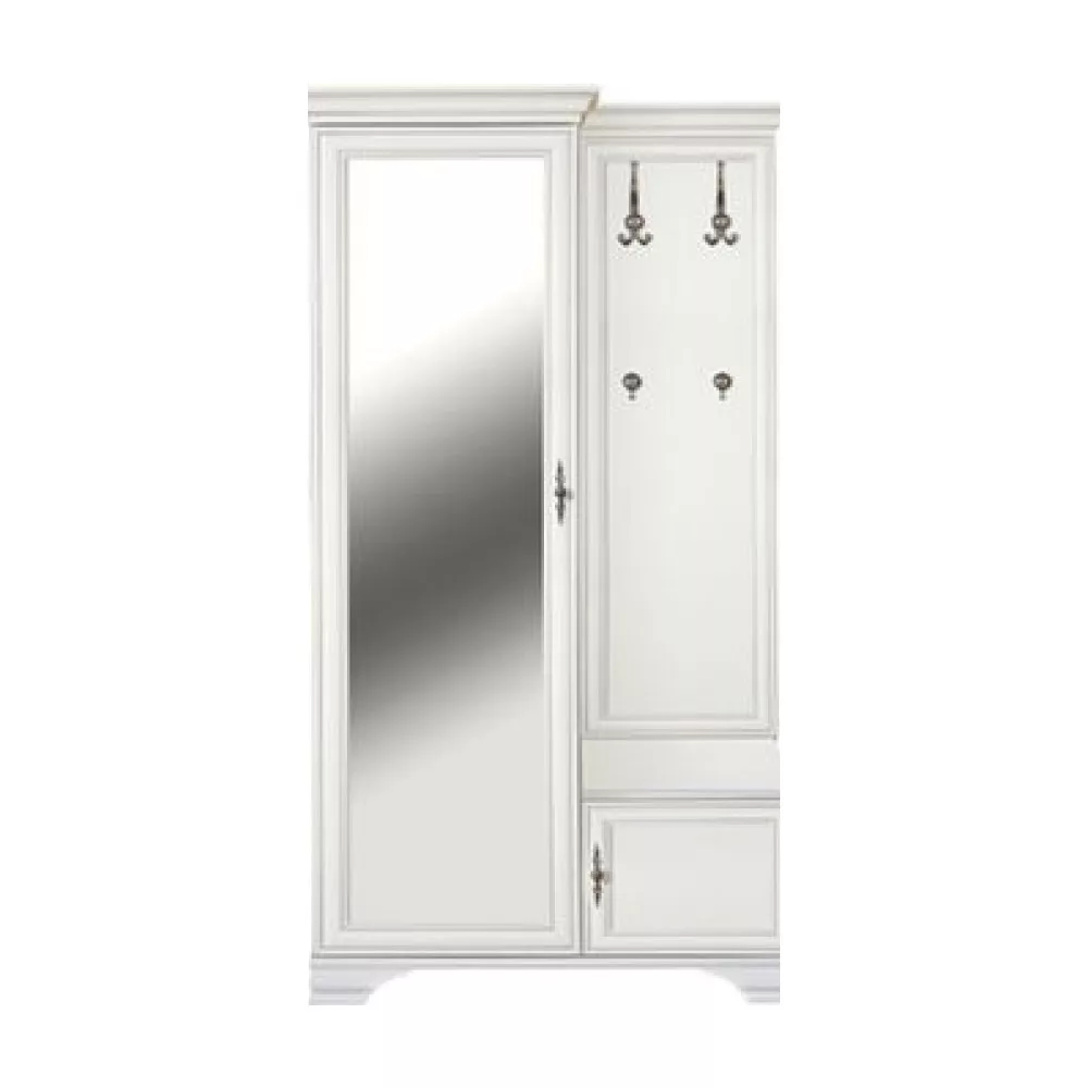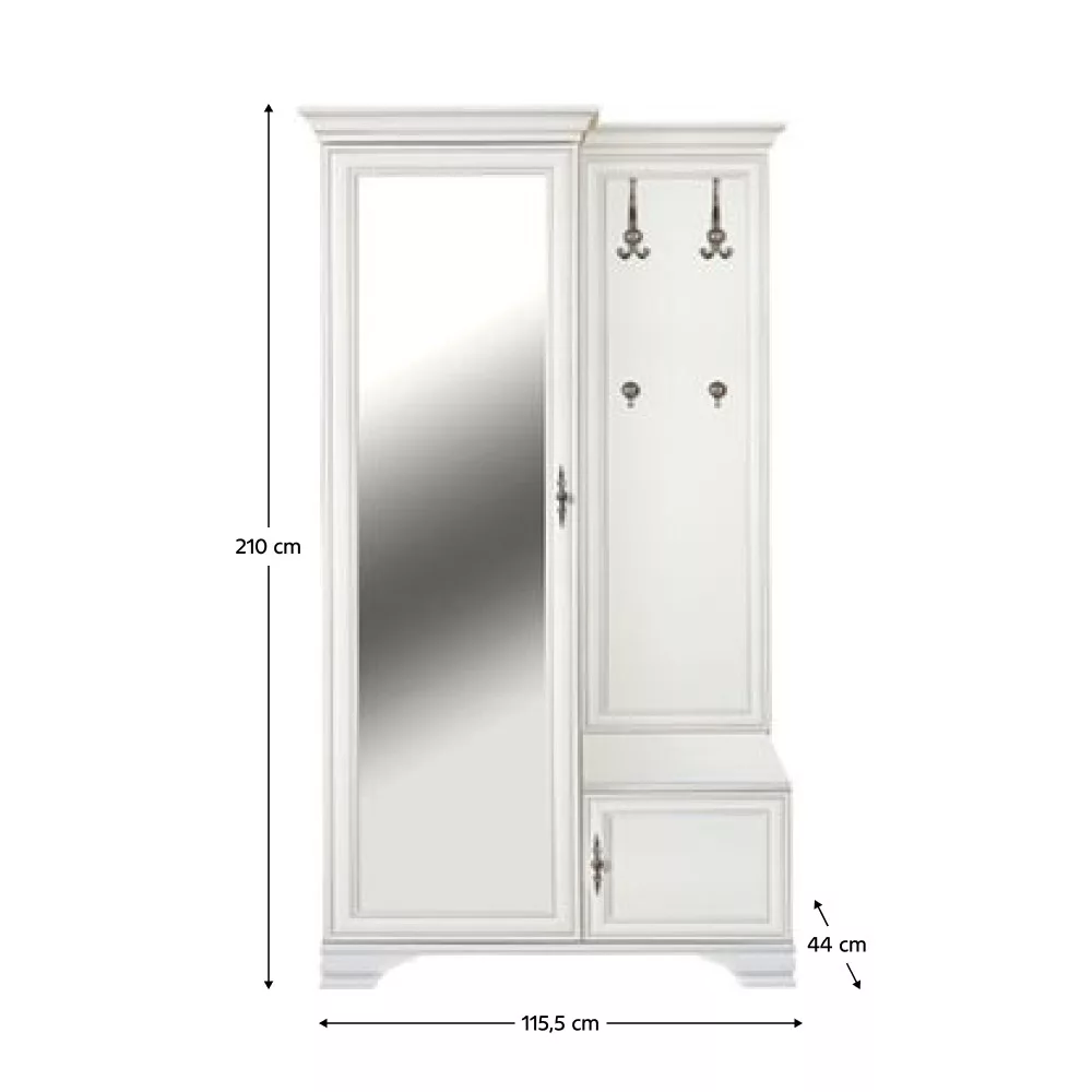 Anyag: laminált DTD Szín: alpesi fehér Méretek (SzxMéxMa): 115,5x44x210 cm Anyag vastagsága: 1,6 cm Fém fogantyúk Fogantyúk színe: antik ezüst Tárhely Tükör Szekrény polccal Polc teherbírása: 4 kg Akasztós rész Fém kampók Kampók színe: antik ezüst Kampók teherbírása: 5 kg Lábakon Lábak magassága: 8 cm Balos kivitelezés Javasoljuk a falhoz rögzíteni Szétszerelve szállítva