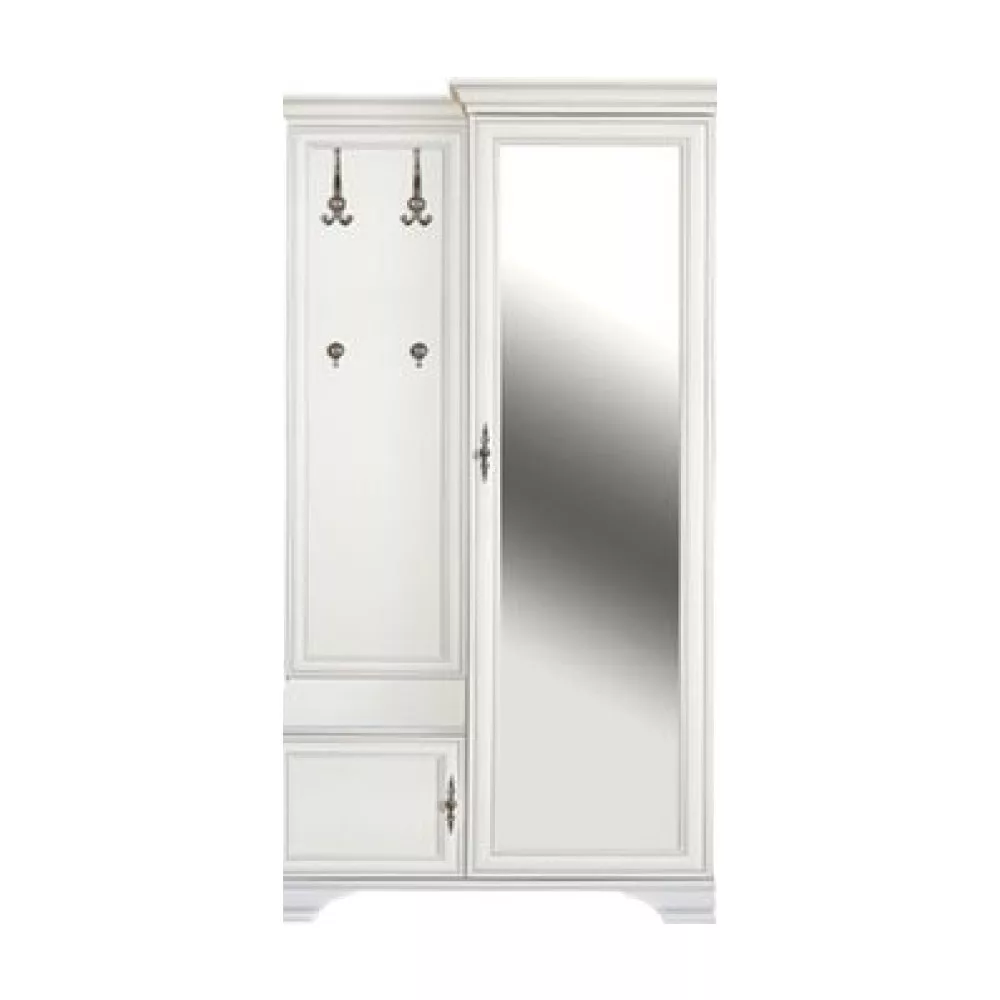 Anyag: laminált DTD Szín: alpesi fehér Méretek (SzxMéxMa): 115,5x44x210 cm Anyag vastagsága: 1,6 cm Fém fogantyúk Fogantyúk színe: antik ezüst Tárhely Tükör Szekrény polccal Polc teherbírása: 4 kg Akasztós rész Fém kampók Kampók színe: antik ezüst Kampók teherbírása: 5 kg Lábakon Lábak magassága: 8 cm Jobbos kivitelezés Javasoljuk a falhoz rögzíteni Szétszerelve szállítva