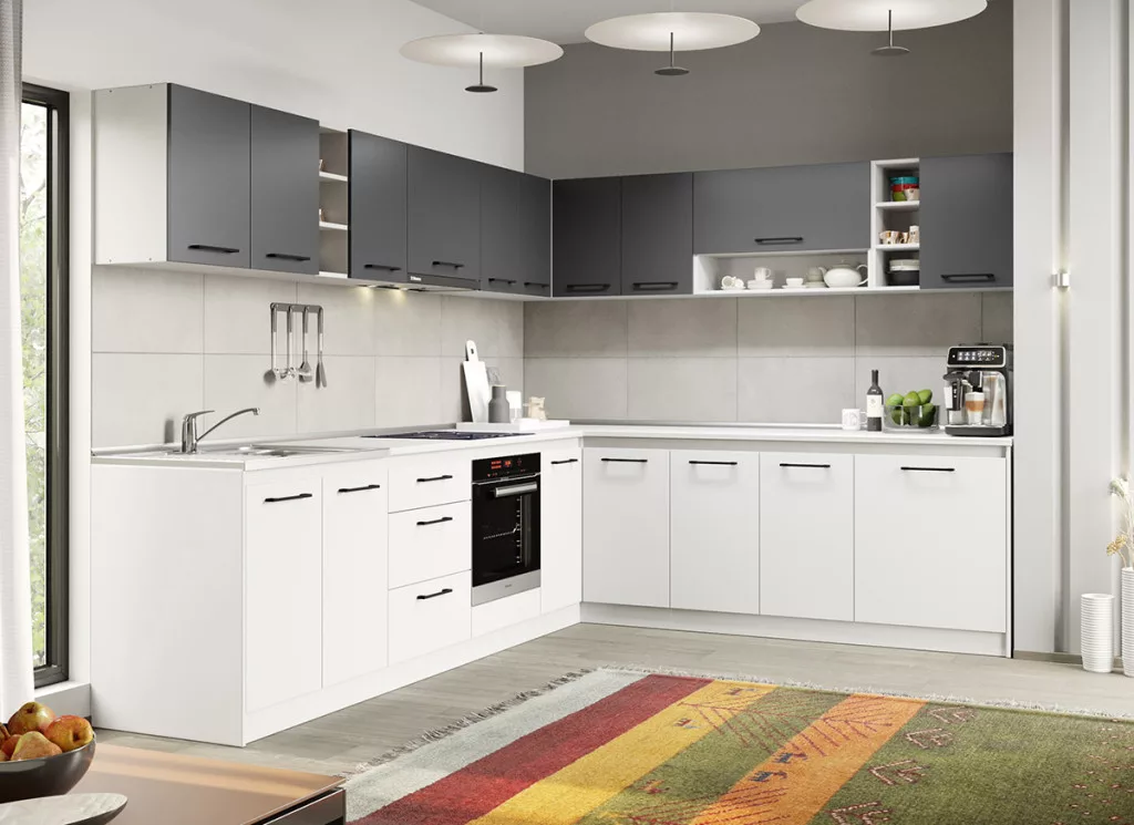 Arthur fehér és szürke konyhabútor - 30 - 301,6/241,6 cm alsó, felső elemei tágas tárolóhelyet biztosít a beépíthető gépek és a konyhai cikkek számára. Az elemek 16 mm-es préselt forgácslapból készülnek. A gyöngyházfehér és antracitszürke felület eleganciát és kifinomultságot közvetít, legyen szó bármilyen belső színvilágról.