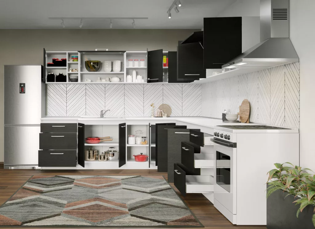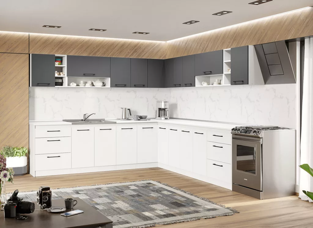 Arthur fehér és szürke konyhabútor - 34 - 281,6/281,6 cm alsó, felső elemei tágas tárolóhelyet biztosít a beépíthető gépek és a konyhai cikkek számára. Az elemek 16 mm-es préselt forgácslapból készülnek. A gyöngyházfehér és antracitszürke felület eleganciát és kifinomultságot közvetít, legyen szó bármilyen belső színvilágról.