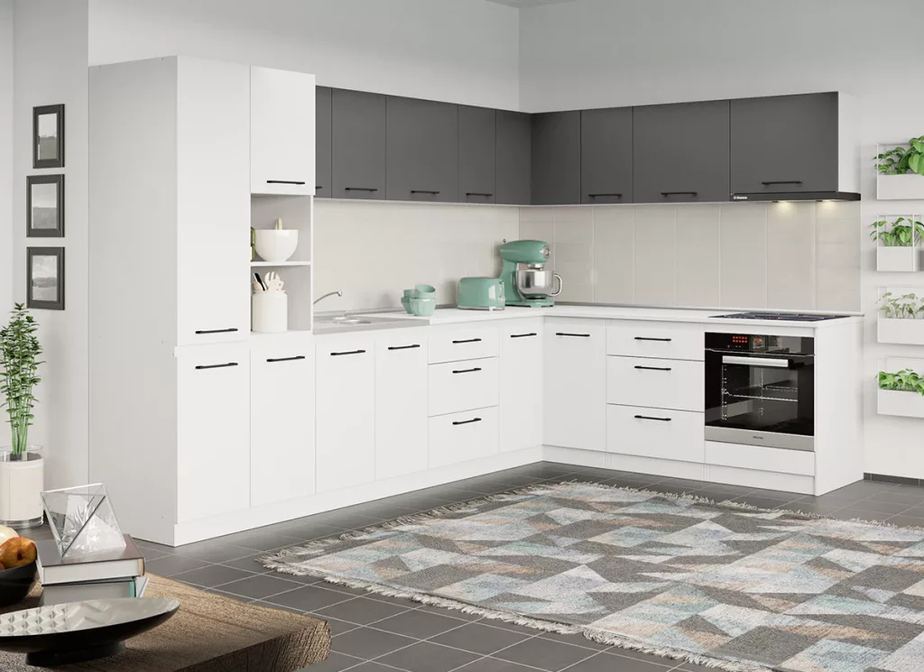 Arthur fehér és szürke konyhabútor - 36 - 320/221,6 cm alsó, felső elemei tágas tárolóhelyet biztosít a beépíthető gépek és a konyhai cikkek számára. Az elemek 16 mm-es préselt forgácslapból készülnek. A gyöngyházfehér és antracitszürke felület eleganciát és kifinomultságot közvetít, legyen szó bármilyen belső színvilágról.